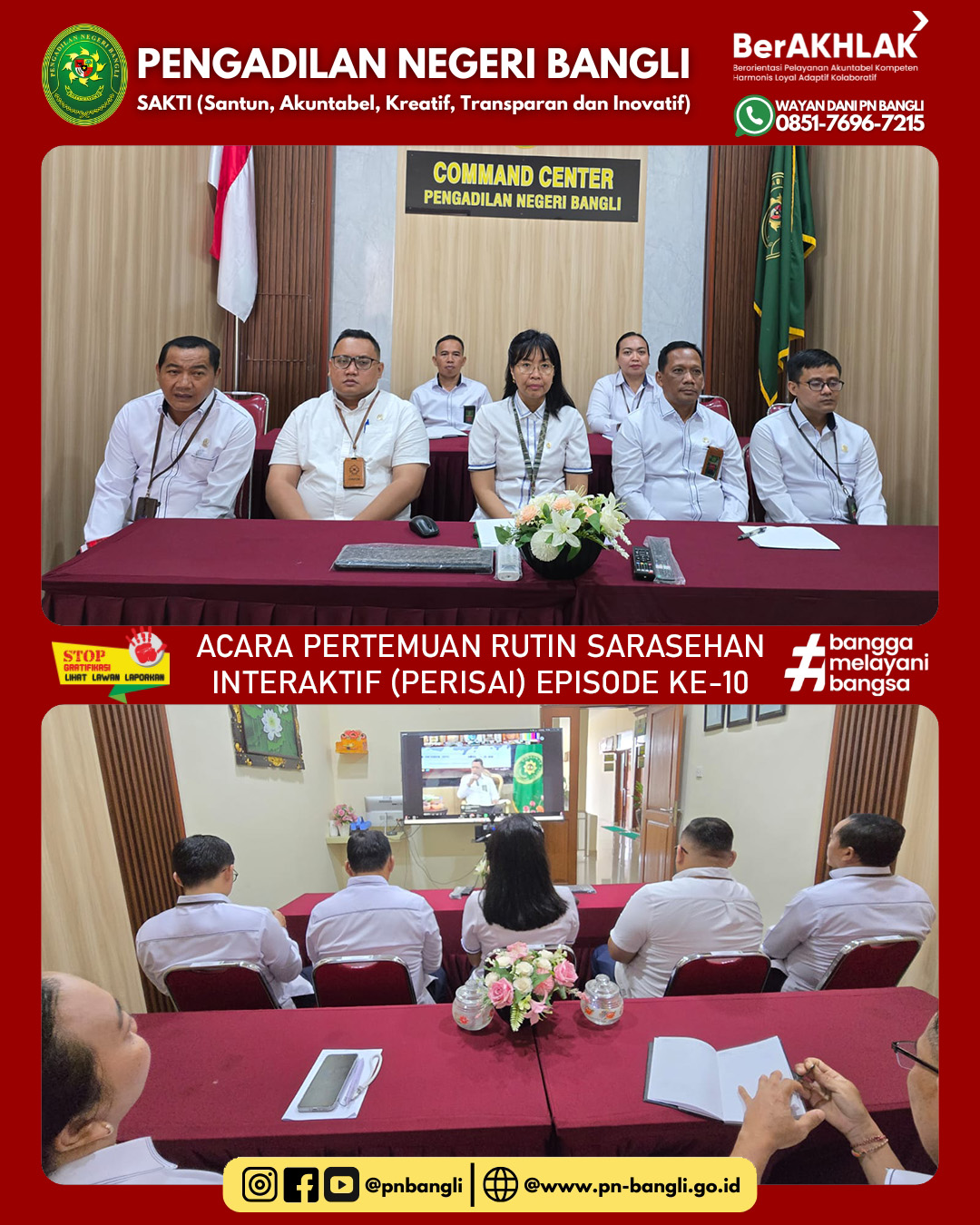 BANGLI - Senin, 06 Oktober 2025 pukul 08.30 Wita s.d. 12.00 WIB, Pengadilan Negeri Bangli mengikuti Acara Pertemuan Rutin Sarasehan Interaktif (Perisai) Episode ke-10, dalam rangka mendorong kultur berdiskusi dan berpikir kritis ilmiah bagi para Hakim dan Tenaga Teknis di lingkungan Peradilan Umum, Direktorat Jenderal Badan Peradilan Umum menyelenggarakan Pertemuan Rutin Sarasehan Interaktif (Perisai) dengan mengangkat tema Mengurai Kompleksitas Esekusi Perdata “ Problematika, Solusi dan Prospek Pembaruan Hukum”, yang dilaksanakan secara virtual melalui Zoom Meeting.