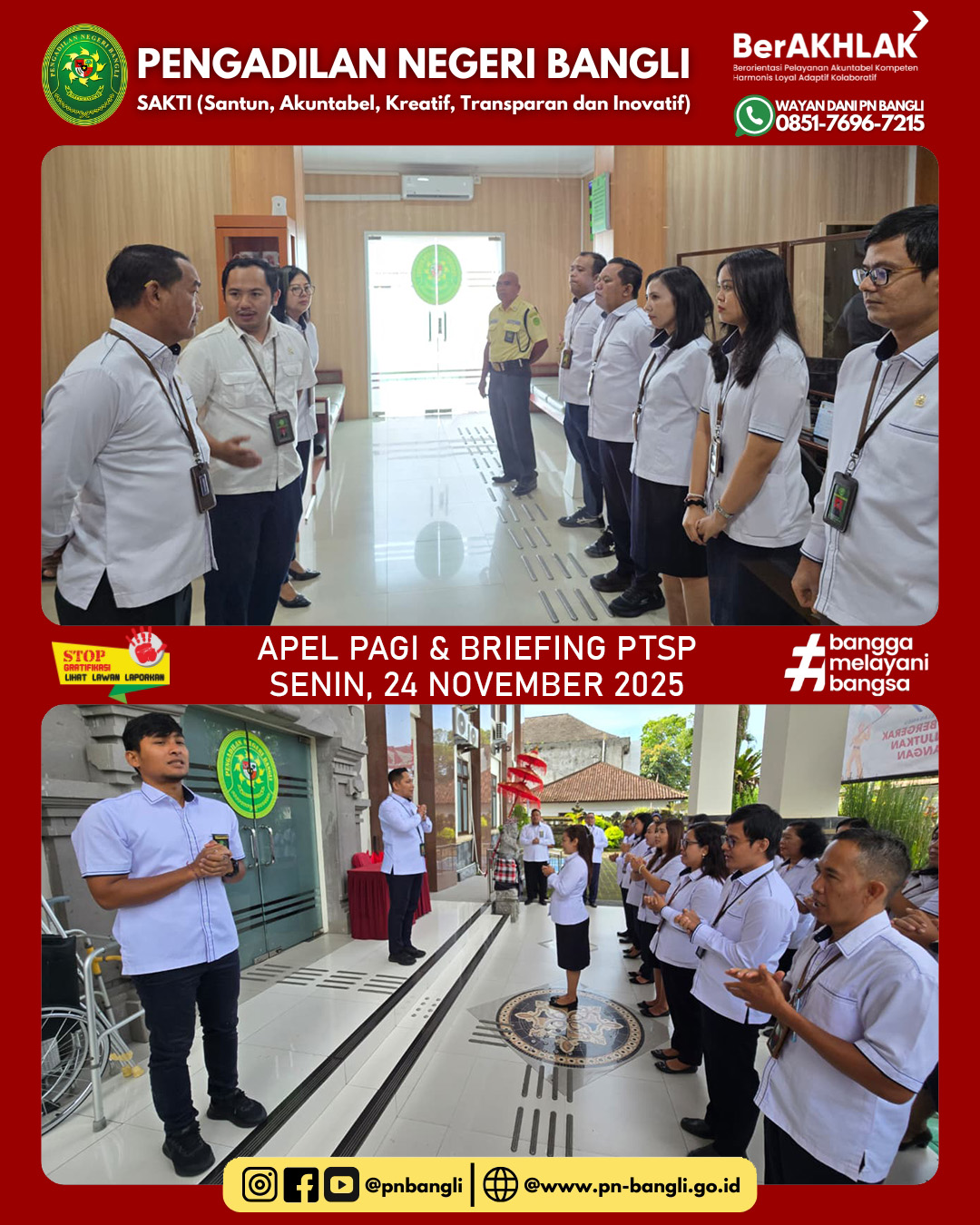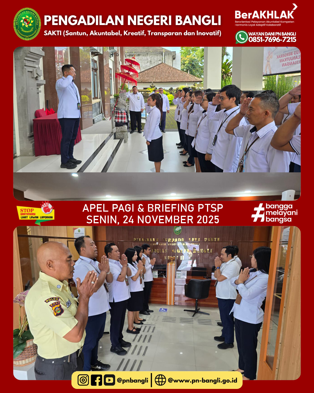 BANGLI - Senin, 24 November 2025, telah dilaksanakan apel pagi yang merupakan upaya penegakan disiplin di lingkungan Pengadilan Negeri Bangli. Bertindak selaku pembina apel adalah Hakim Pengadilan Negeri Bangli, Bapak Rimang Kartono Rizal, S.H. dan Petugas Apel adalah Kasubag PTIP.