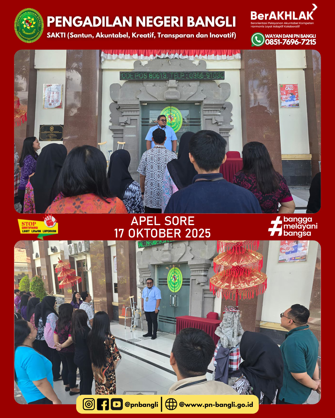 BANGLI - Jumat, 17 Oktober 2025, telah diadakan kegiatan Apel Sore, Hakim Pengadilan Negeri Bangli, Bapak Seftra Bestian, S.H., M.H. selaku Pembina Apel menyampaikan selalu menjaga kesehatan dan sampai bertemu di minggu depan.
