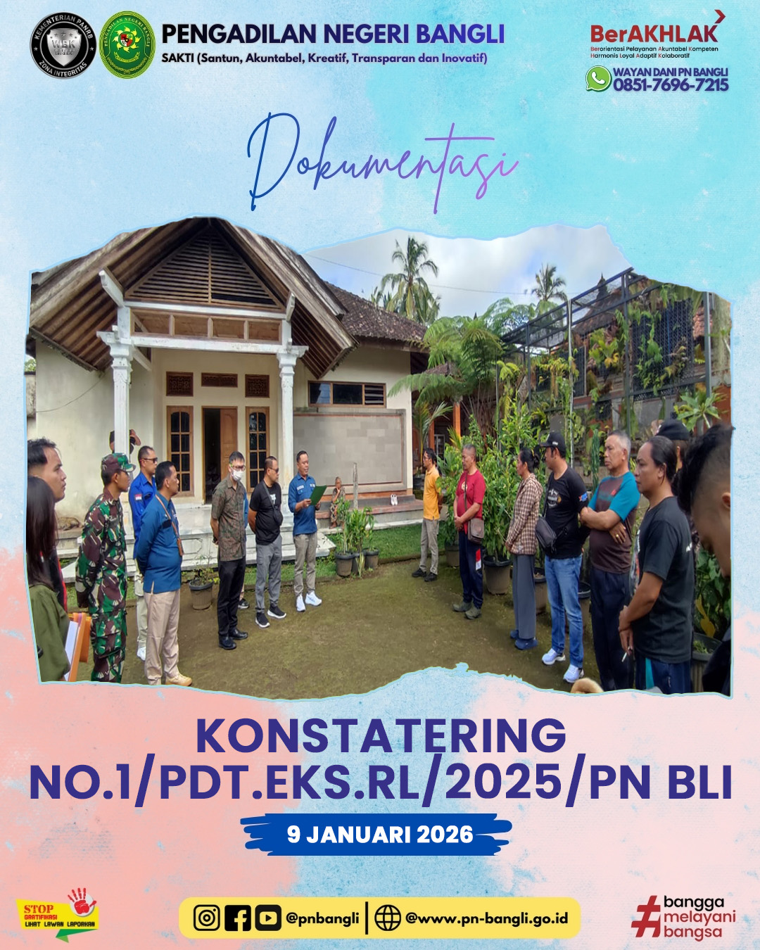 BANGLI - Jumat, 9 Januari 2026 pukul 08.00 wita, Panitera Pengadilan Negeri Bangli Sugeng Irfandi, S.H. di dampingi Jurusita Pengadilan Negeri Bangli melaksanakan Konstatering perkara perdata No.1/Pdt.Eks.RL/2025/PN Bli, yang berlokasi di Desa Penglumbaran, Kecamatan Susut, Kabupaten Bangli, Provinsi Bali.