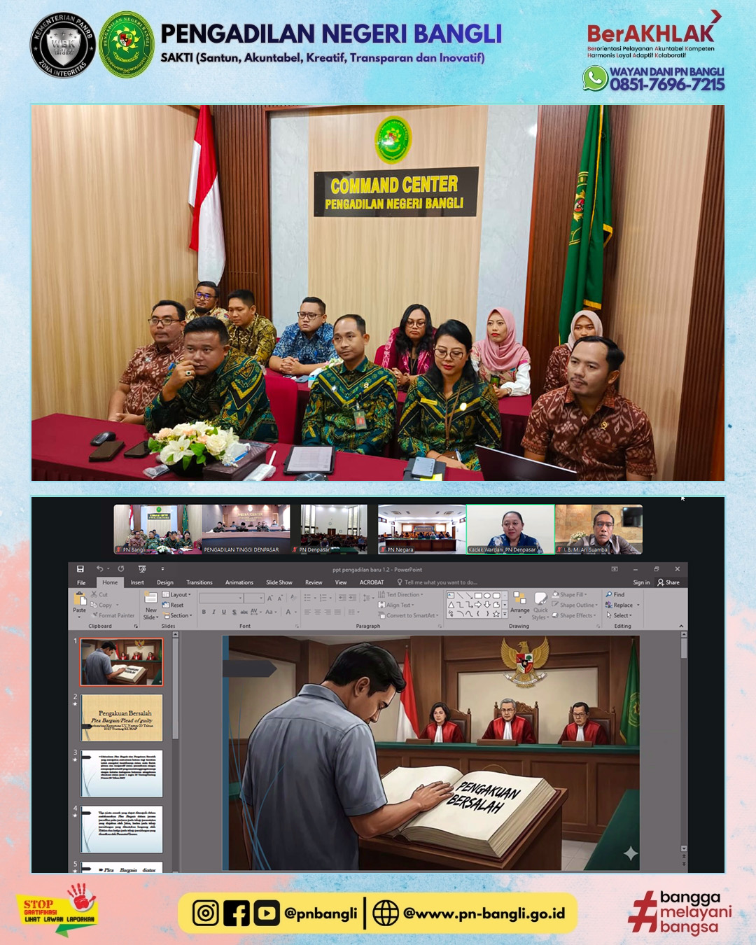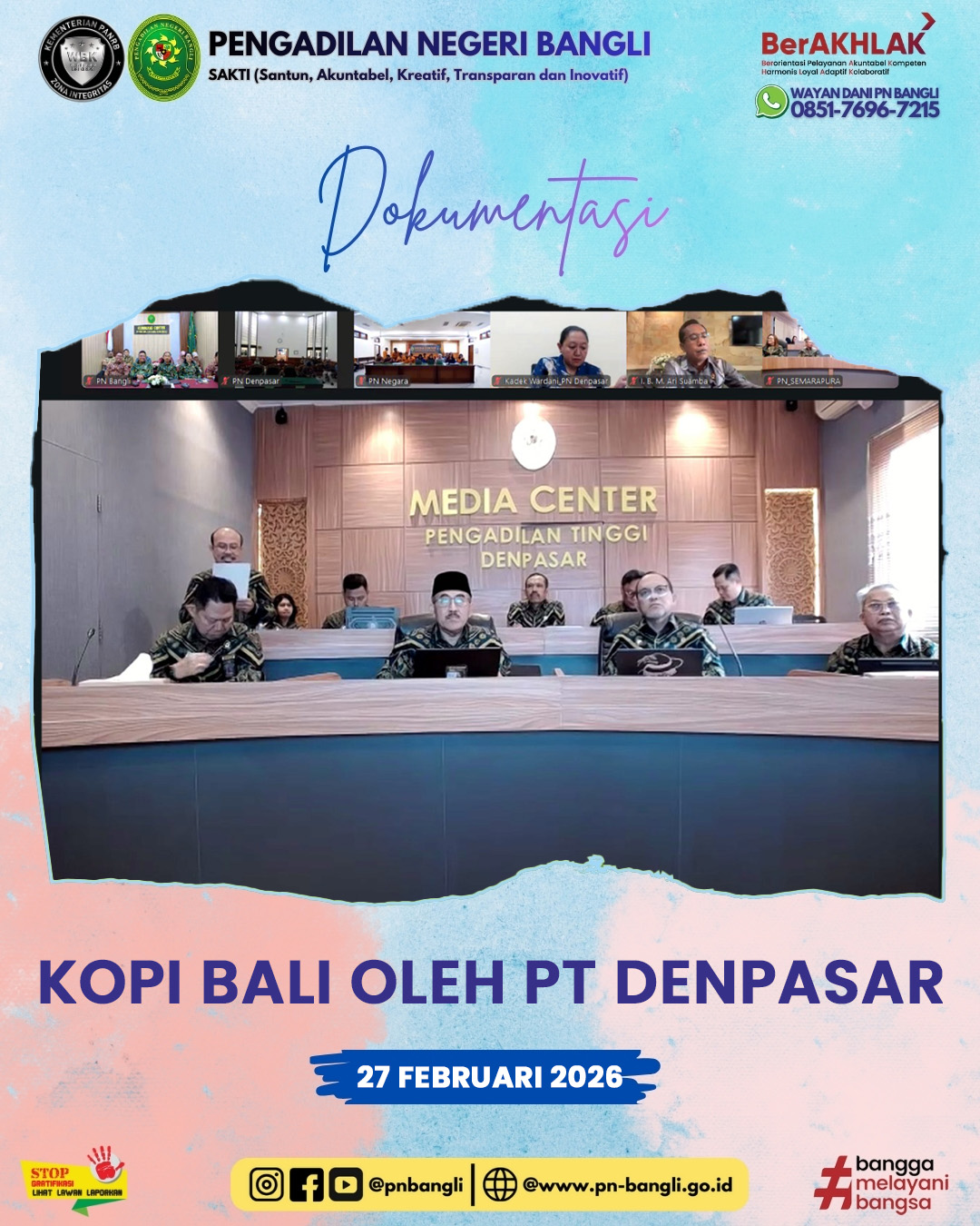 BANGLI - Jumat, 27 Februari 2026 pukul 09.00 Wita s.d. 11.00 Wita, telah dilaksanakannya pembinaan dan pengawasan dalam kegiatan “Kopi Bali” (Komunikasi dan Koordinasi Pagi bersama Aparatur Pengadilan Negeri) oleh Ketua Pengadilan Tinggi Denpasar dan Wakil Ketua Pengadilan Tinggi Denpasar dalam rangka Peningkatan Kinerja serta Disiplin Aparatur Peradilan, yang dilaksanakan melalui daring zoom meeting di ruang rapat Pengadilan Negeri Bangli.
