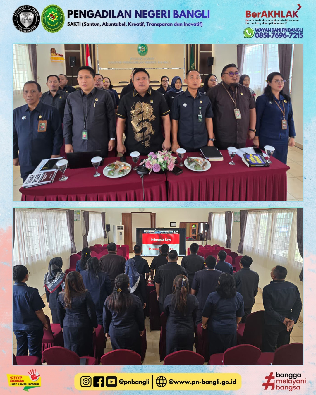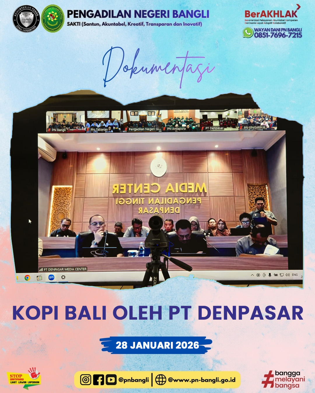 BANGLI - Rabu, 28 Januari 2026 pukul 09.00 Wita s.d. Selesai, telah dilaksanakannya pembinaan dan pengawasan dalam kegiatan “Kopi Bali” (Komunikasi dan Koordinasi Pagi bersama Aparatur Pengadilan Negeri) oleh Ketua Pengadilan Tinggi Denpasar dan Wakil Ketua Pengadilan Tinggi Denpasar dalam rangka Peningkatan Kinerja serta Disiplin Aparatur Peradilan, yang dilaksanakan melalui daring zoom meeting di ruang rapat Pengadilan Negeri Bangli.