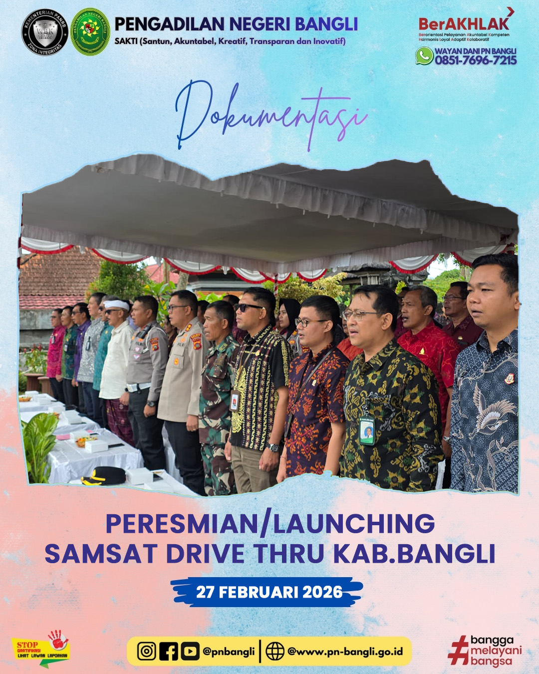 BANGLI - Jumat, 27 Februari 2025 pukul 09.30 wita s.d selesai. Dalam rangka Kegiatan Peresmian/Launching Samsat Drive Thru yang di laksanakan oleh UPTD Pelayanan Pajak dan Retribusi Provinsi Bali di Kabupaten Bangli untuk memberikan kemudahan, kecepatan dan Kenyamanan pelayanan pada masyarakat Kabupaten Bangli, acara di selenggarakan di area Mal Pelayanan Publik Kabupaten Bangli.
