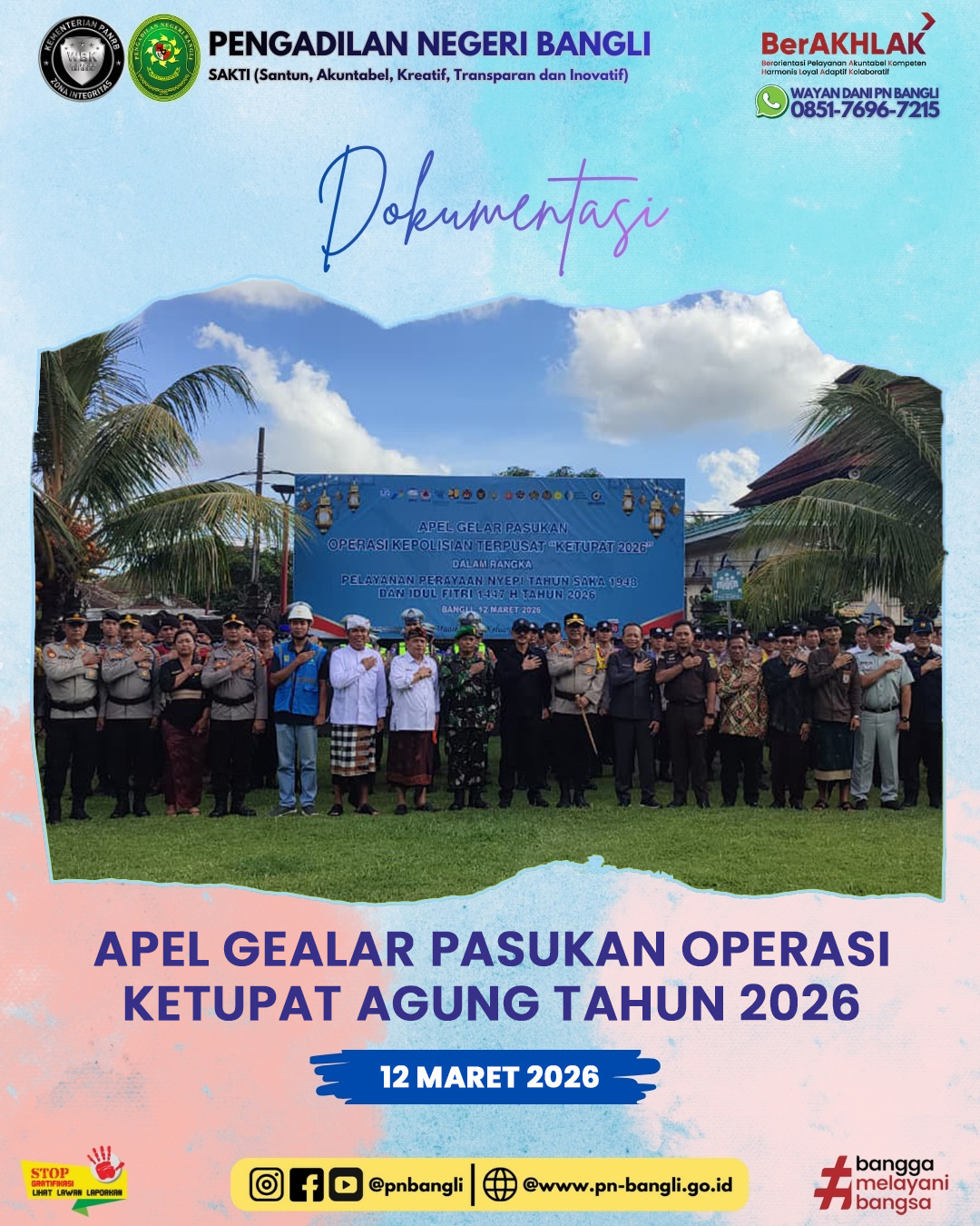 BANGLI - Kamis, 12 Maret 2026 pukul 16.00 wita s.d selesai. Panitera Pengadilan Negeri Bangli mewakili Ketua Pengadilan Negeri Bangli mengikuti Apel Gelar Pasukan Operasi Kepolisian Terpusat "Ketupat Agung 2026" dalam rangka kesiapan pengamanan Idul Fitri 1447 H Tahun 2026 di Lapangan Kepolisian Daerah Bangli.