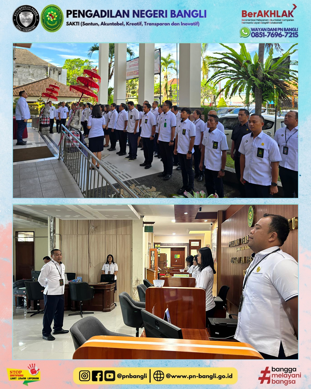 BANGLI - Senin, 2 Februari 2026, telah dilaksanakan apel pagi yang merupakan upaya penegakan disiplin di lingkungan Pengadilan Negeri Bangli. Bertindak selaku pembina apel adalah Hakim Pengadilan Negeri Bangli, Bapak Widyastomo Isworo, S.H., dalam amanatnya Bapak Hakim berpesan agar tidak ada interaksi dengan pengguna pelayanan Pengadilan dan tetap menjaga Integritas.