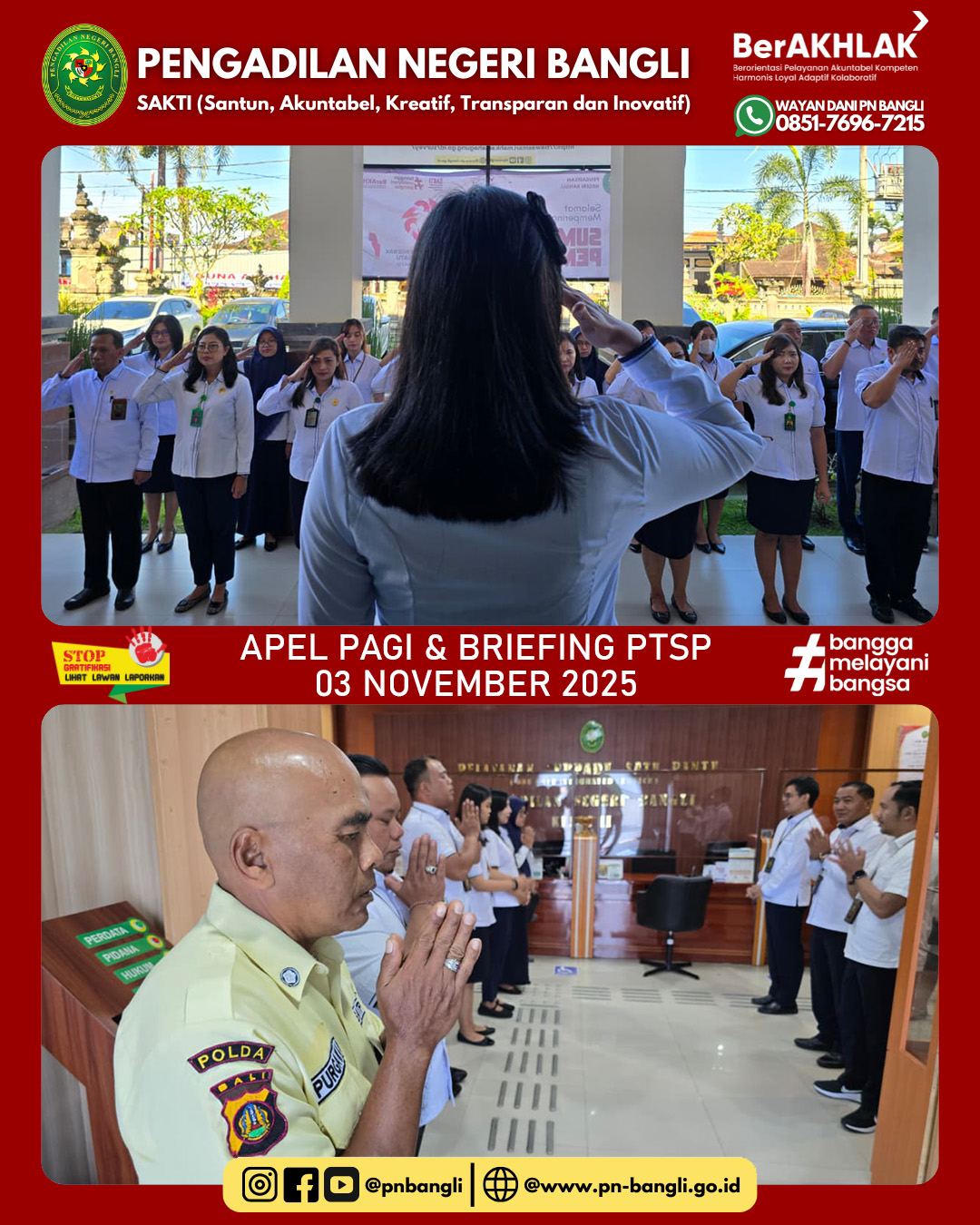 BANGLI - Senin, 03 November 2025, telah dilaksanakan apel pagi yang merupakan upaya penegakan disiplin di lingkungan Pengadilan Negeri Bangli. Bertindak selaku pembina apel adalah Wakil Ketua Pengadilan Negeri Bangli, Ibu Ratih Kusuma Wardhani, S.H, M.H., dan Petugas Apel adalah Panitera Muda Perdata.