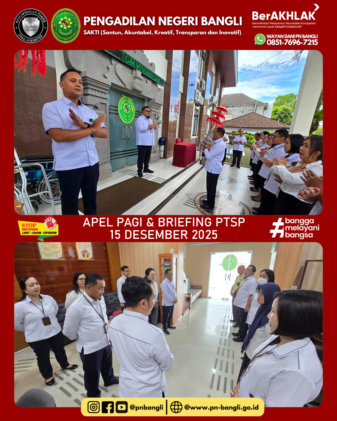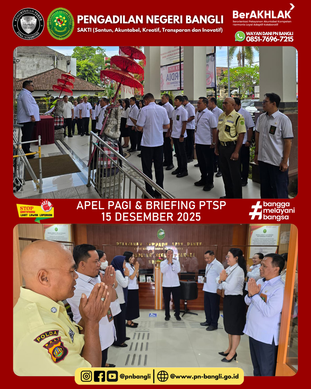 BANGLI - Senin, 15 Desember 2025, telah dilaksanakan apel pagi yang merupakan upaya penegakan disiplin di lingkungan Pengadilan Negeri Bangli. Bertindak selaku pembina apel adalah Hakim Pengadilan Negeri Bangli, Bapak Seftra Bestian, S.H., M.H. dan Petugas Apel adalah Kepaniteraan Hukum.