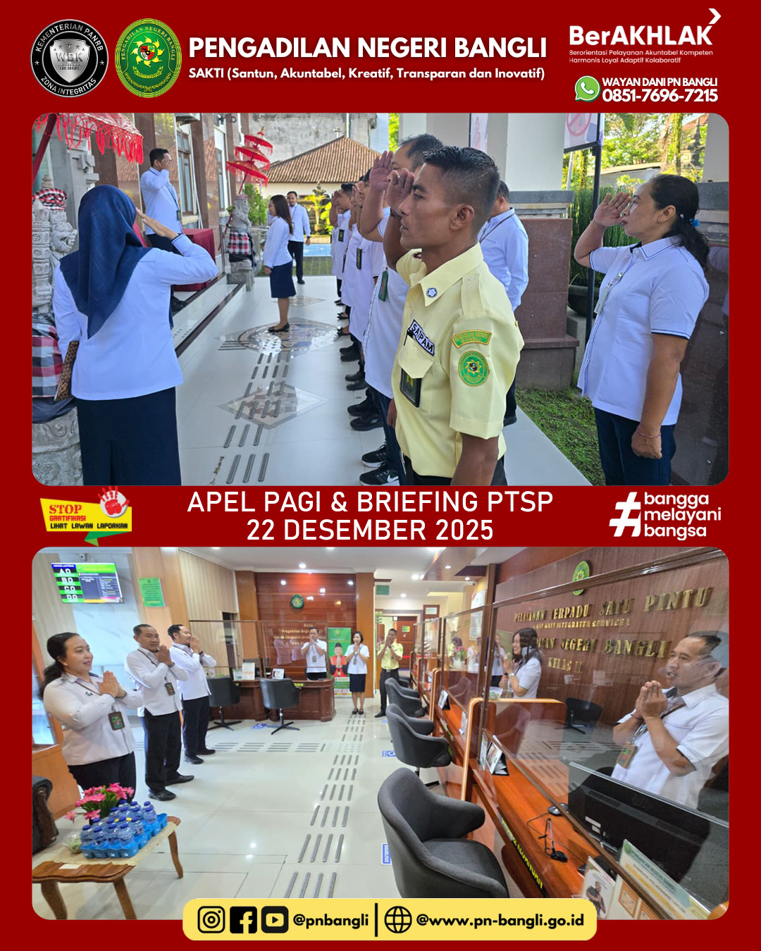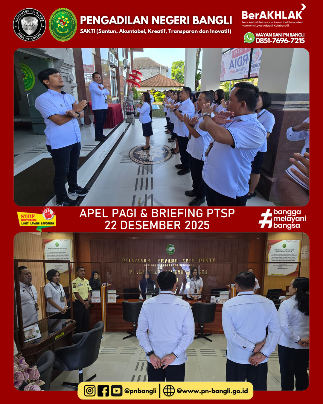 BANGLI - Senin, 22 Desember 2025, telah dilaksanakan apel pagi yang merupakan upaya penegakan disiplin di lingkungan Pengadilan Negeri Bangli. Bertindak selaku pembina apel adalah Hakim Pengadilan Negeri Bangli, Bapak Rimang Kartono Rizal, S.H. dan Petugas Apel adalah Kasubag PTIP.