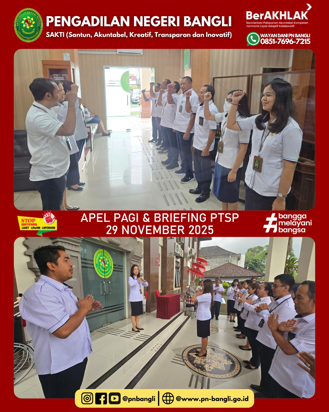 Selesai apel, dilanjutkan dengan briefing PTSP oleh Ketua, Hakim Pengawas PTSP dan Panitera Pengadilan Negeri Bangli yang di ikuti oleh Petugas PTSP dan Petugas Keamanan Pengadilan Negeri Bangli.