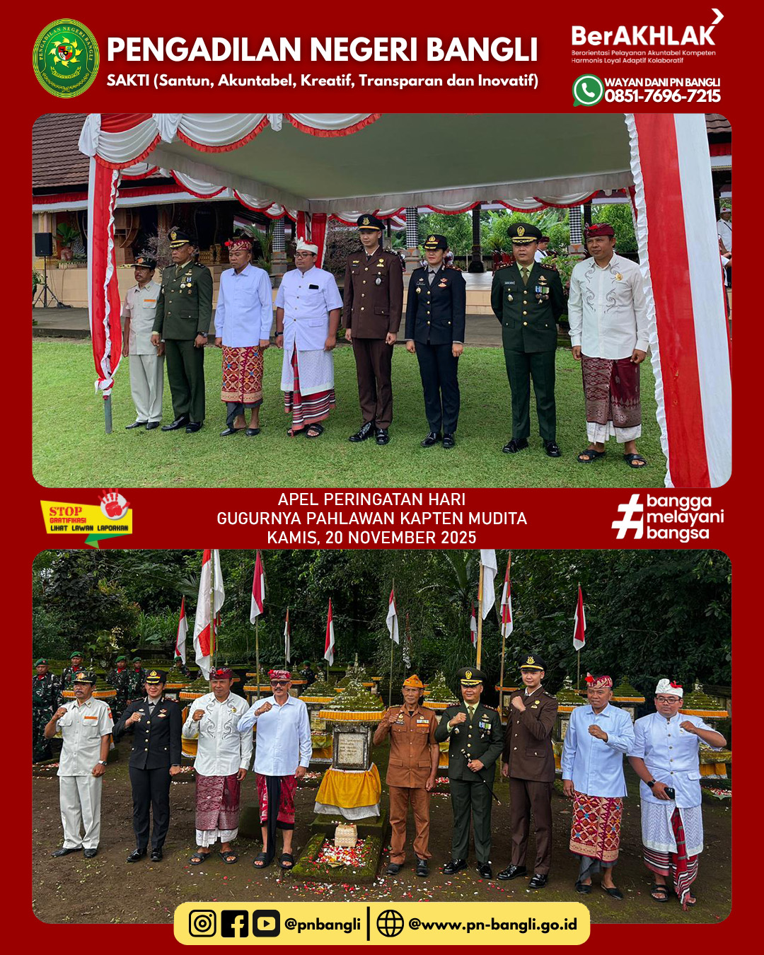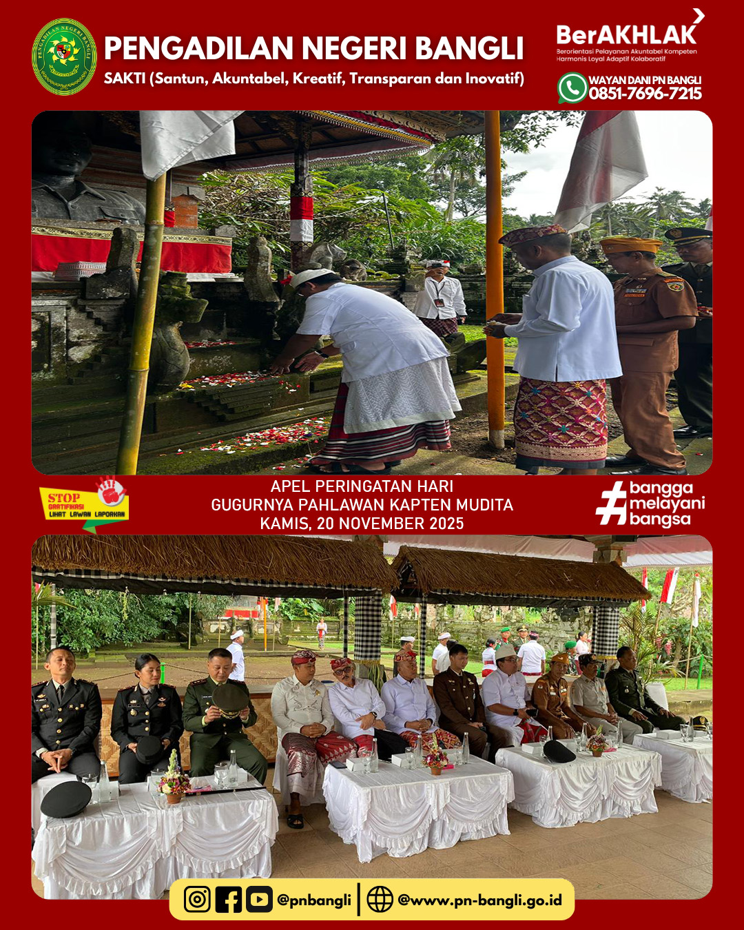 BANGLI - Kamis, 20 November 2025 pukul 08.00 wita, Hakim Pengadilan Negeri Bangli, Bapak I Gede Parama Iswara, S.H. mewakili Ketua Pengadilan Negeri Bangli mengikuti Apel peringatan hari gugurnya Pahlawan Kapten Mudita di Tugu Makam Pahlawan Desa Penglipuran Bangli, bersama dengan jajaran Forkompimda Kab.Bangli.