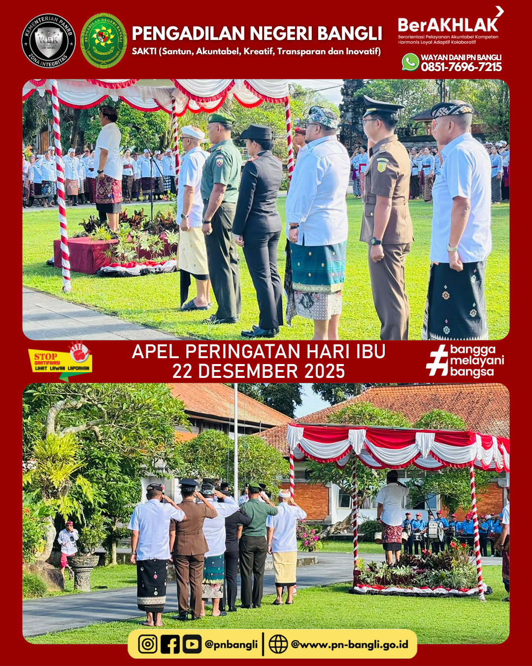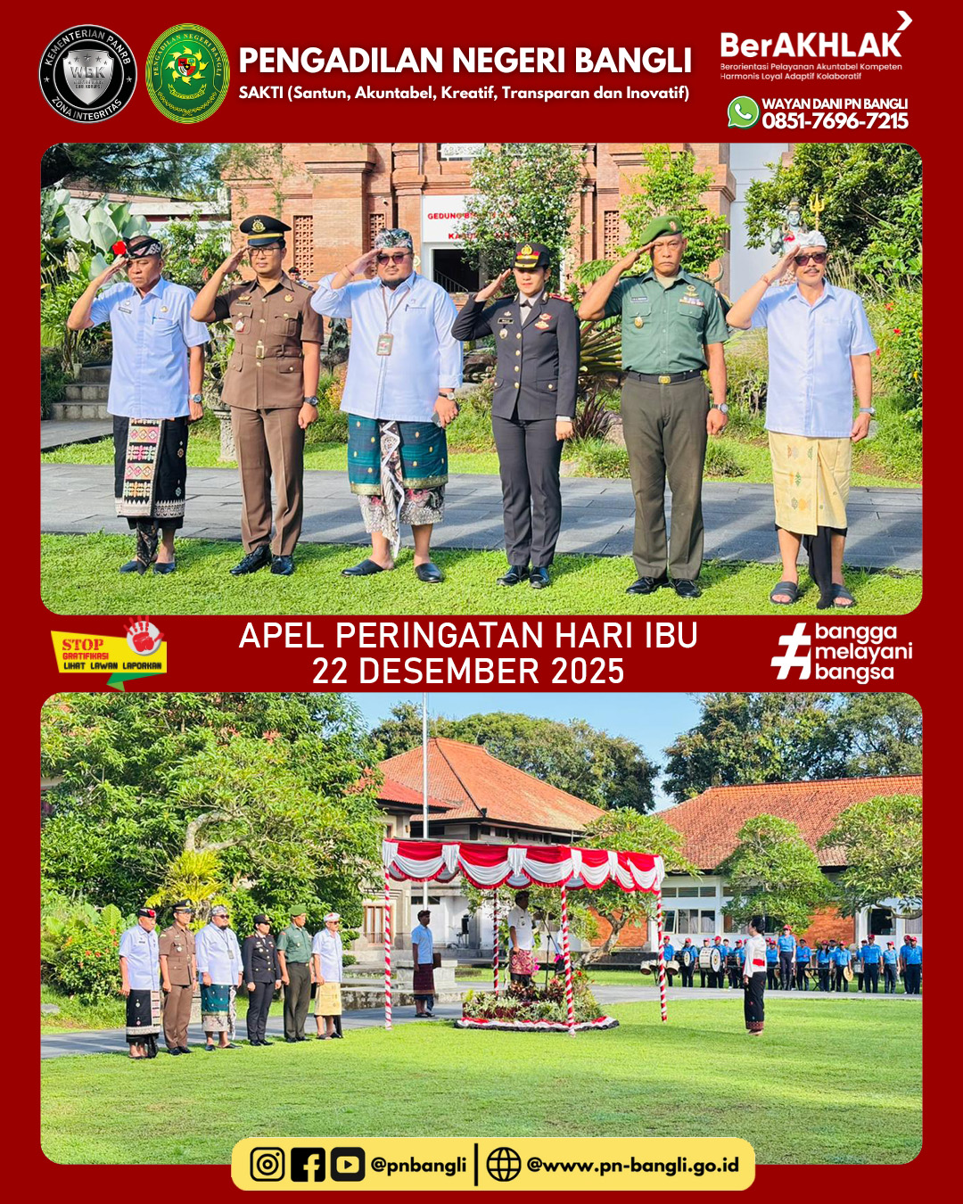 BANGLI - Senin, 22 Desember 2025 pukul 07.30 wita s.d selesai. Hakim Pengadilan Negeri Bangli, Bapak Seftra Bestian, S.H., M.H. menghadiri Upacara Peringatan Hari Ibu yang ke-97 Tahun 2025, yang bertempat di halaman kantor Bupati Bangli, bersama dengan jajaran Forkompimda Kab.Bangli.
