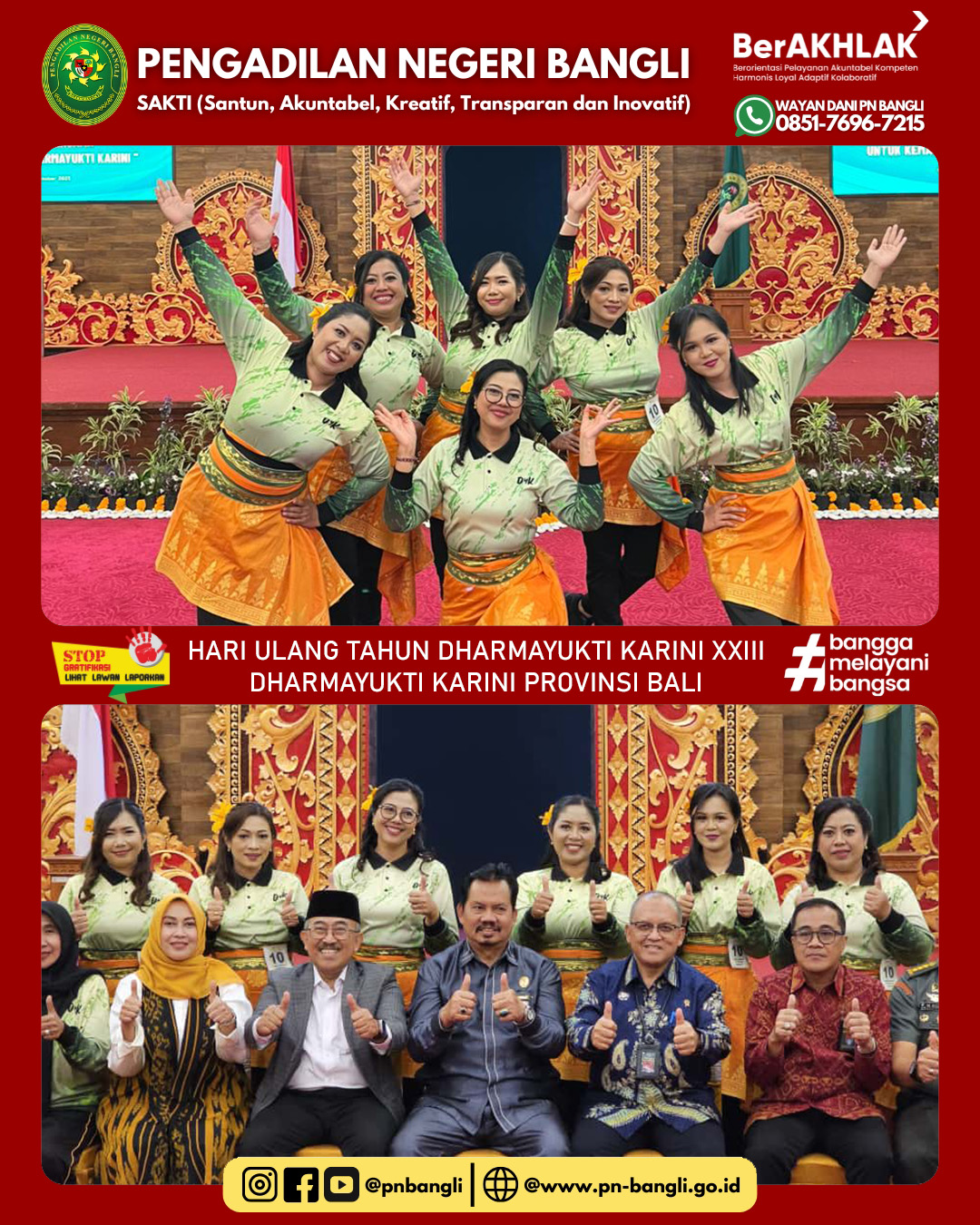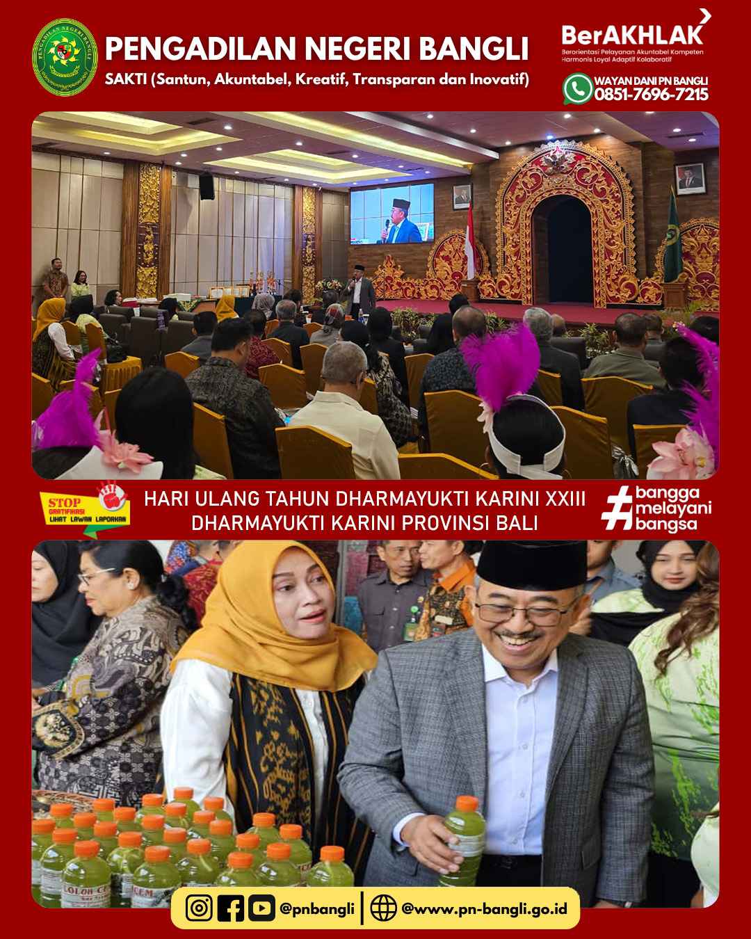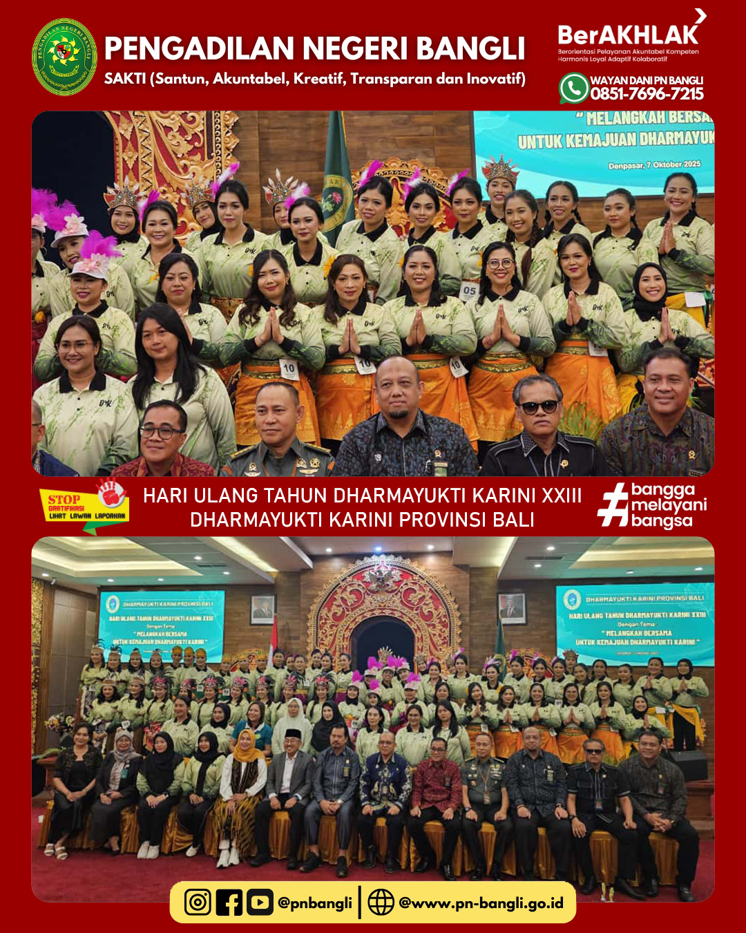 BANGLI - Rabu, 07 Oktober 2025 pukul 09.00 Wita s/d Selesai, Dharmayukti Karini Cabang Bangli mengikuti kegiatan Peringatan Hari Ulang Tahun Dharmayukti Karini XXIII Tahun 2025 dengan tema "MELANGKAH BERSAMA UNTUK KEMAJUAN DHARMAYUKTI KARINI". Pelaksanaan Pertemuan Daerah bertempat di Bale Agung Pengadilan Tinggi Denpasar.
