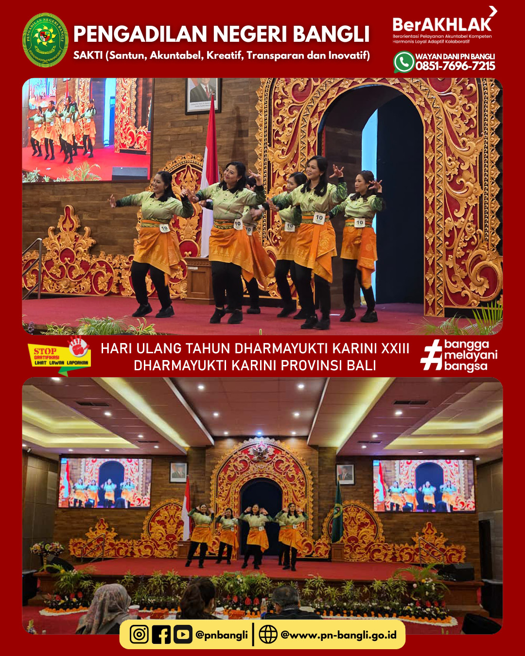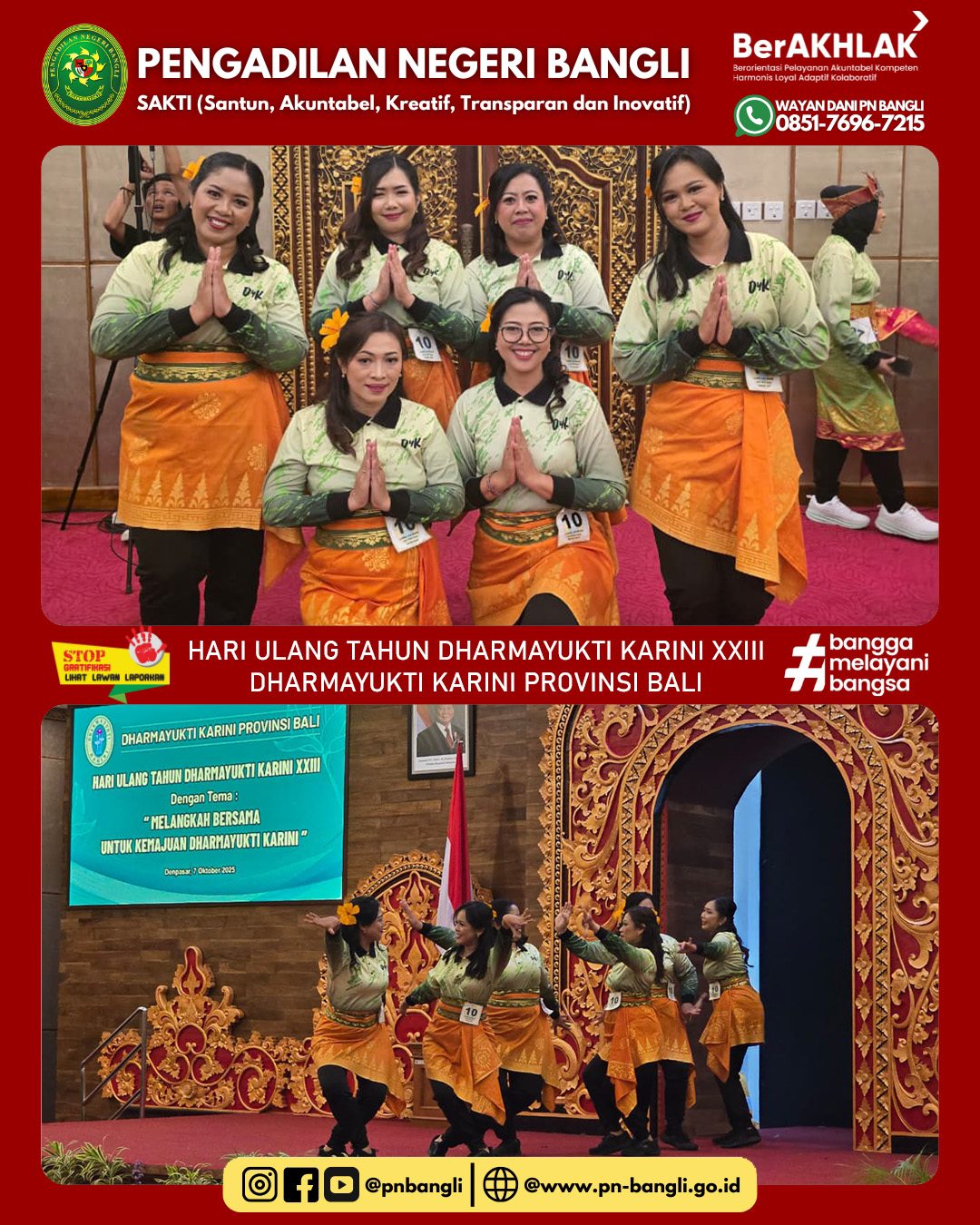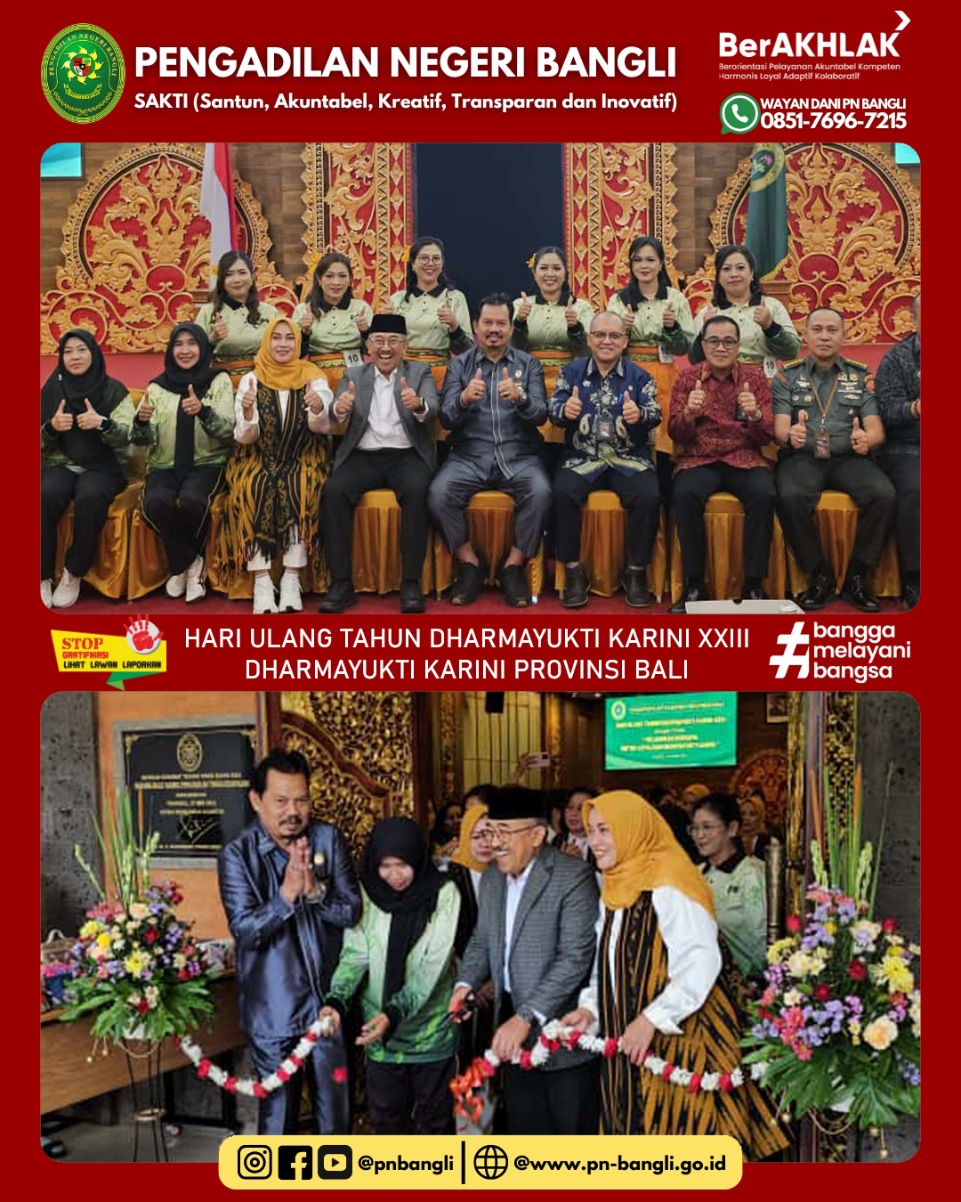 BANGLI - Rabu, 07 Oktober 2025 pukul 09.00 Wita s/d Selesai, Dharmayukti Karini Cabang Bangli mengikuti kegiatan Peringatan Hari Ulang Tahun Dharmayukti Karini XXIII Tahun 2025 dengan tema "MELANGKAH BERSAMA UNTUK KEMAJUAN DHARMAYUKTI KARINI". Pelaksanaan Pertemuan Daerah bertempat di Bale Agung Pengadilan Tinggi Denpasar.