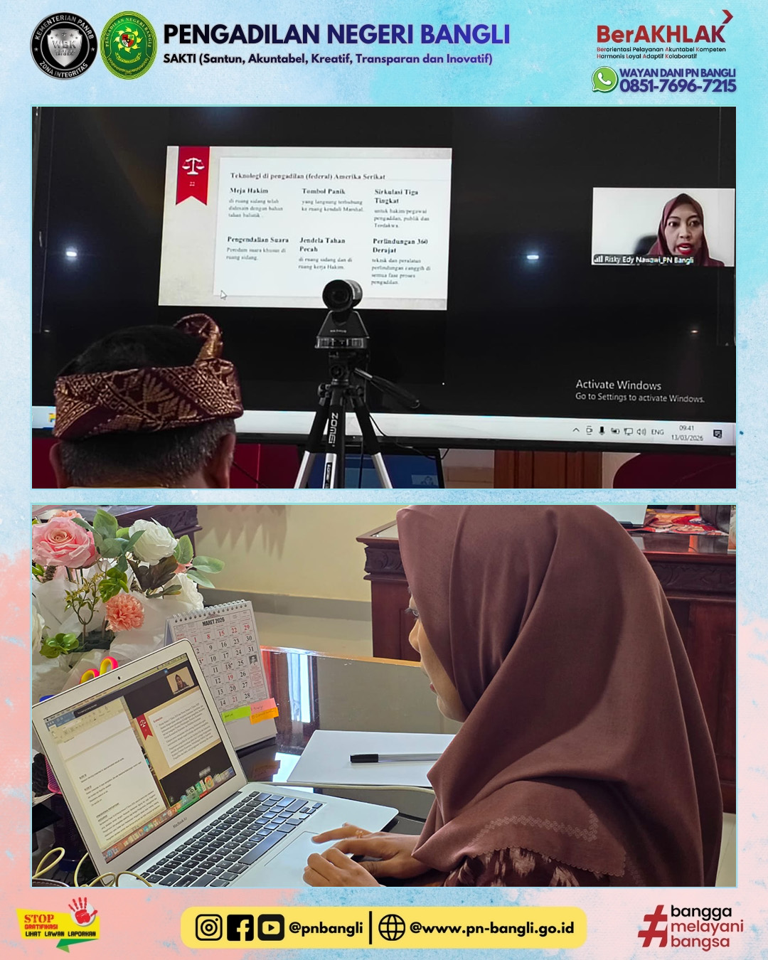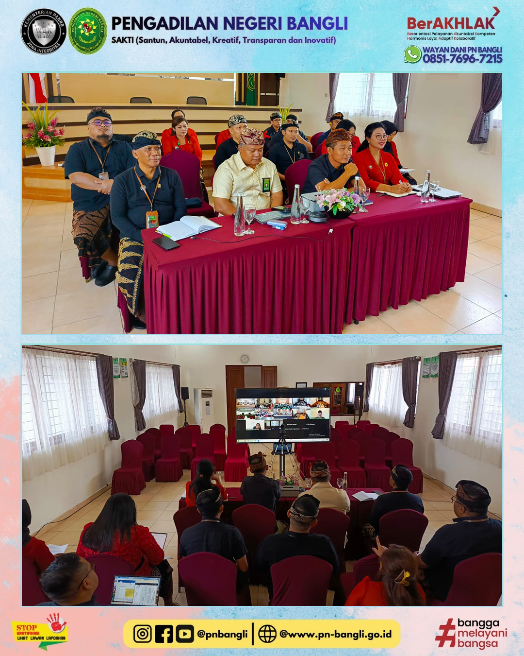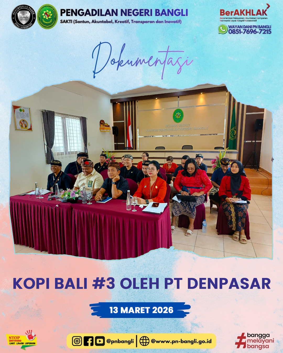 BANGLI - Jumat, 13 Maret 2026 pukul 09.00 Wita s.d. Selesai, telah dilaksanakannya pembinaan dan pengawasan dalam kegiatan “Kopi Bali” (Komunikasi dan Koordinasi Pagi bersama Aparatur Pengadilan Negeri) ke 3 di bulan maret tahun 2026 oleh Ketua Pengadilan Tinggi Denpasar dan Wakil Ketua Pengadilan Tinggi Denpasar dalam rangka Peningkatan Kinerja serta Disiplin Aparatur Peradilan, yang dilaksanakan melalui daring zoom meeting di ruang rapat Pengadilan Negeri Bangli.