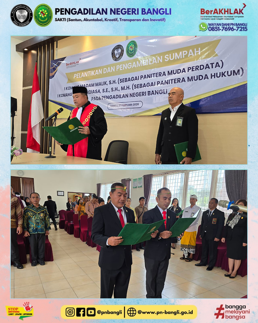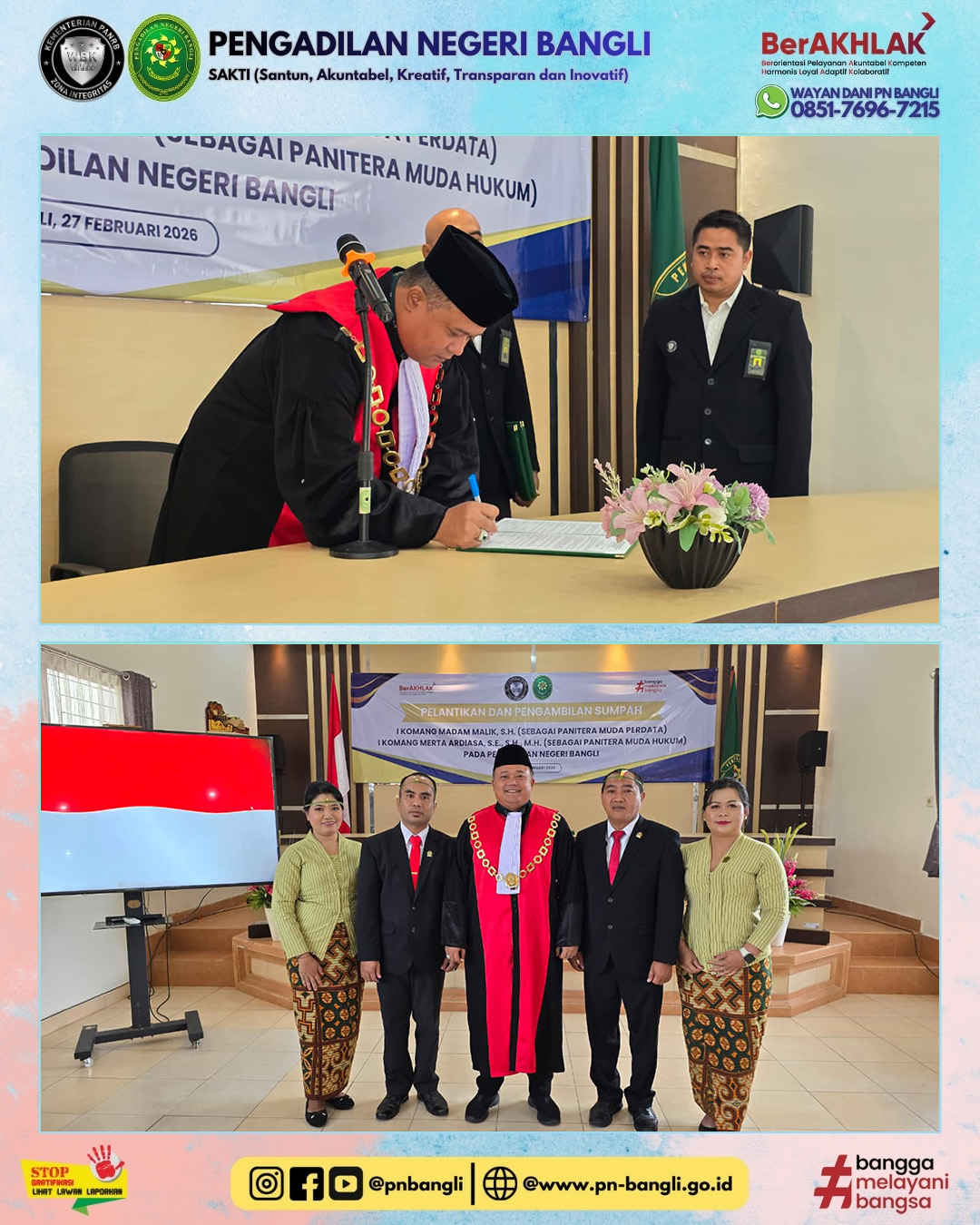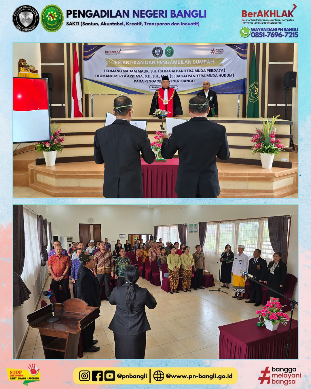 BANGLI - Jumat, 27 Februari 2026 pukul 09.30 wita. Ketua Pengadilan Negeri Bangli Bapak Hilarius Grahita Setya Atmaja, S.H. Mengambil Sumpah dan Melantik Bapak I Komang Madam Malik, S.H. sebagai Panitera Muda Perdata dan Bapak I Komang Merta Ardiasa, S.E., S.H., M.H. sebagai Panitera Muda Hukum pada Pengadilan Negeri Bangli. Acara berlangsung lancar dan khidmat diikuti oleh seluruh jajaran Pengadilan Negeri Bangli.