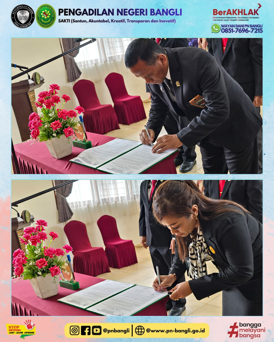 Dalam pelantikan dan pengambilan sumpah tersebut, dibacakan dan ditandatangani juga Pakta Integritas oleh pejabat yang baru dilantik. Dalam sambutannya Ketua Pengadilan Negeri menyampaikan sebuah pantun serta nasehat, dan juga sambutan dari Wakil Ketua Pengadilan Negeri Bangli yang baru.