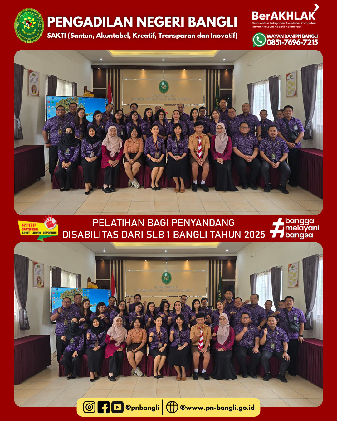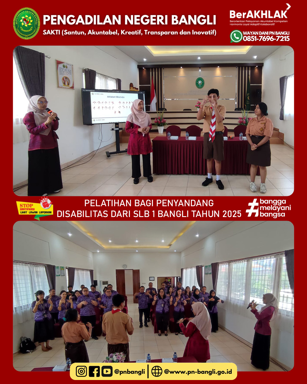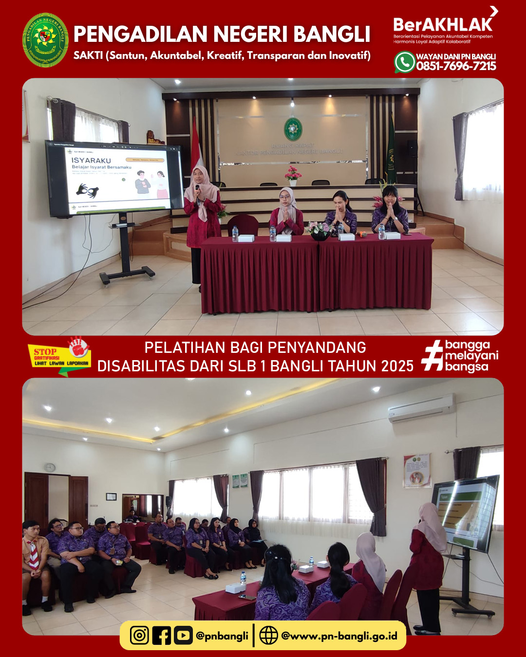 BANGLI - Jumat, 24 Oktober 2025 Pukul 11.00 s.d Selesai. Telah diadakan Sosialisasi Pelatihan Bagi Penyandang Disabilitas Dari SLB 1 Bangli Tahun 2025. kegiatan ini dihadiri oleh segenap Hakim dan Aparatur Pengadilan, Guru dan Siswa Tuli SLB Negeri 1 Bangli. Tujuan pelatihan Bahasa Isyarat supaya Pelayanan Terpadu Satu Pintu Pengadilan Negeri Bangli serta Seluruh Aparatur Pengadilan Negeri Bangli mengetahui bagaimana Etika berinteraksi melalui Bahasa Isyarat kepada Penyandang Disabilitas sehingga penyampaian hak-hak kepada Penyandang Disabilitas yang berhadapan dengan hukum akan terpenuhi.