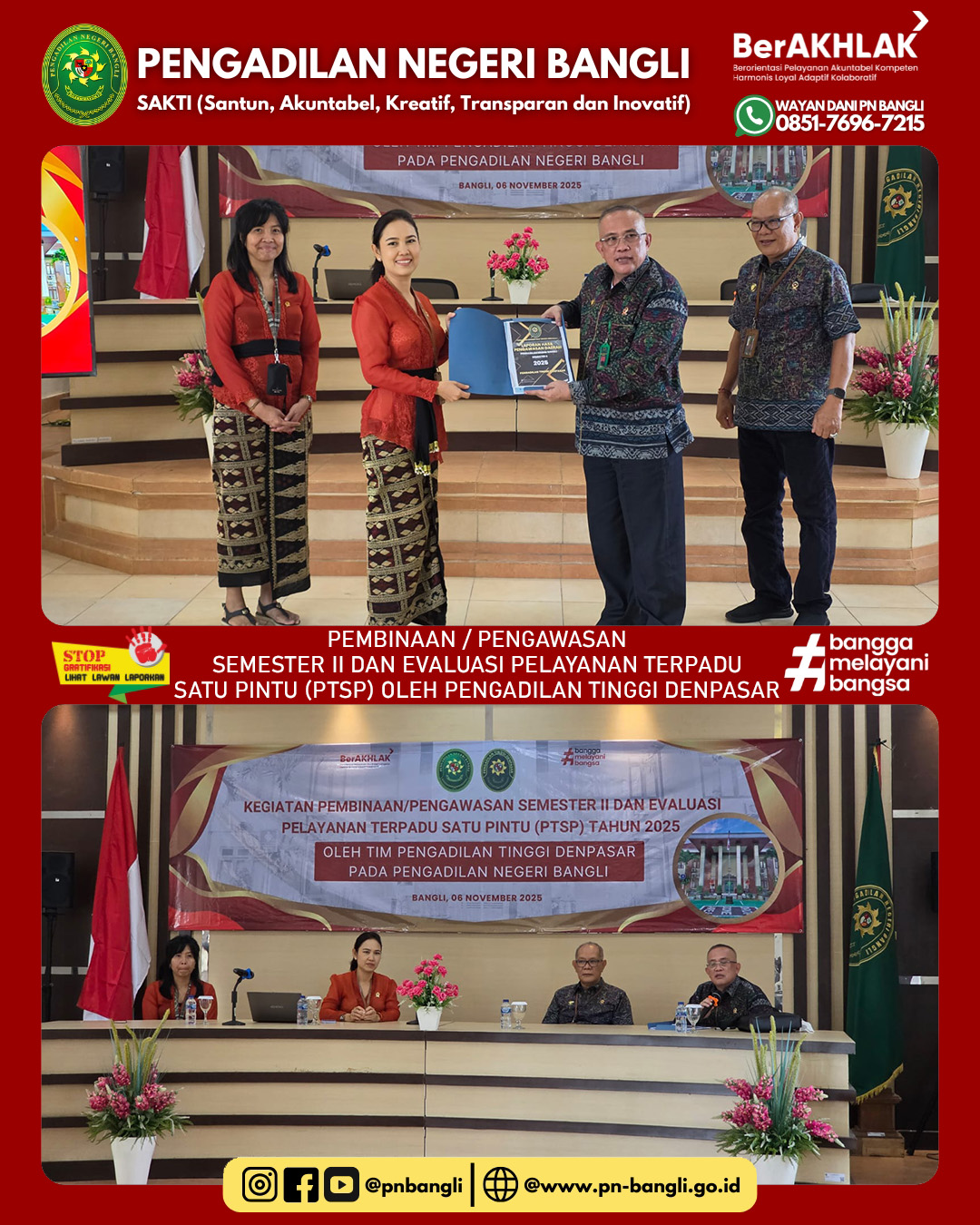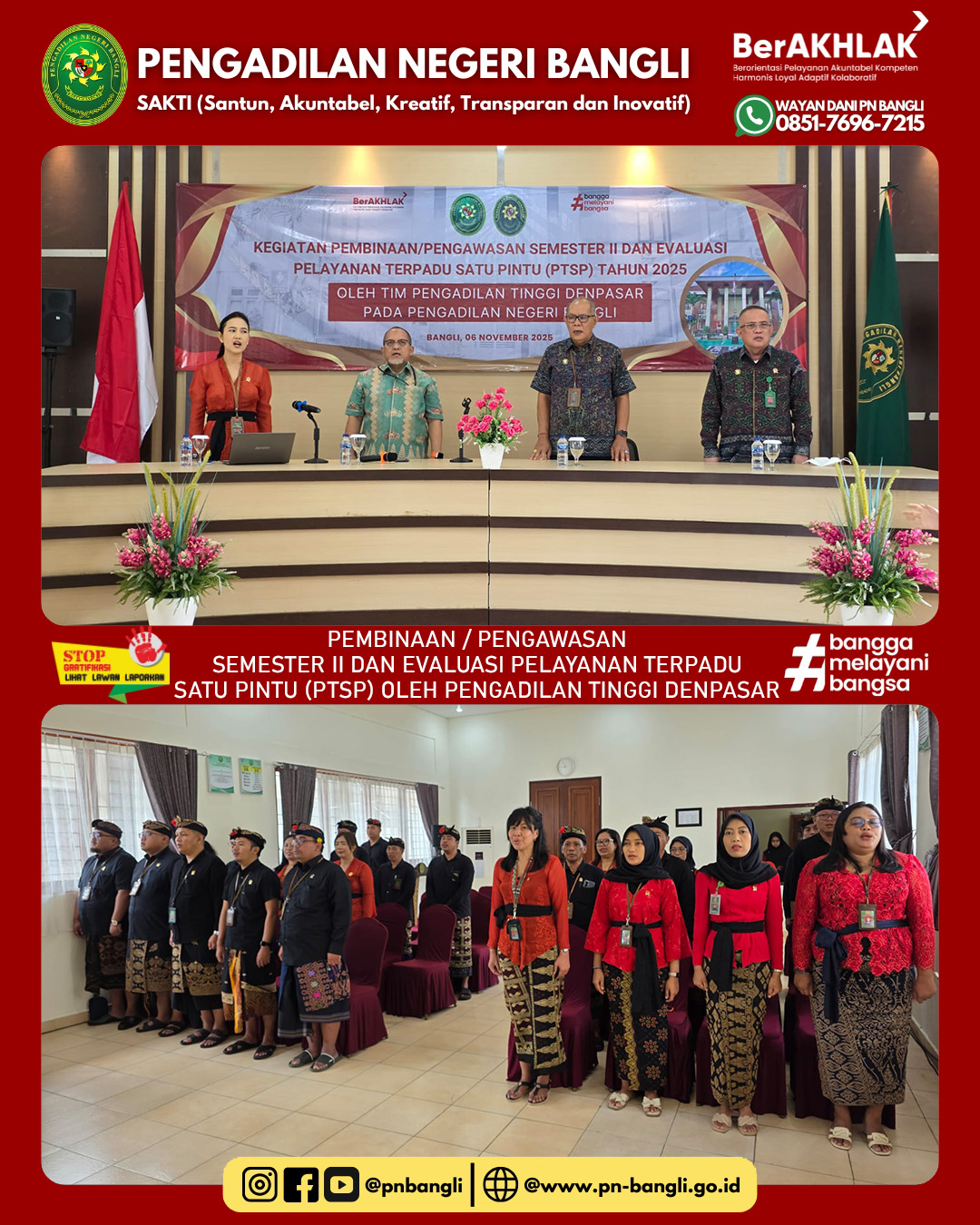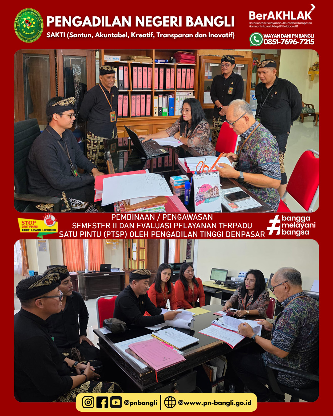 BANGLI - Jumat, 06 November 2025, telah dilaksanakan Kegiatan Pembinaan / Pengawasan Semester II dan Evaluasi Pelayanan Terpadu Satu Pintu (PTSP) Tahun 2025 Oleh Pengadilan Tinggi Denpasar Pada Pengadilan Negeri Bangli.