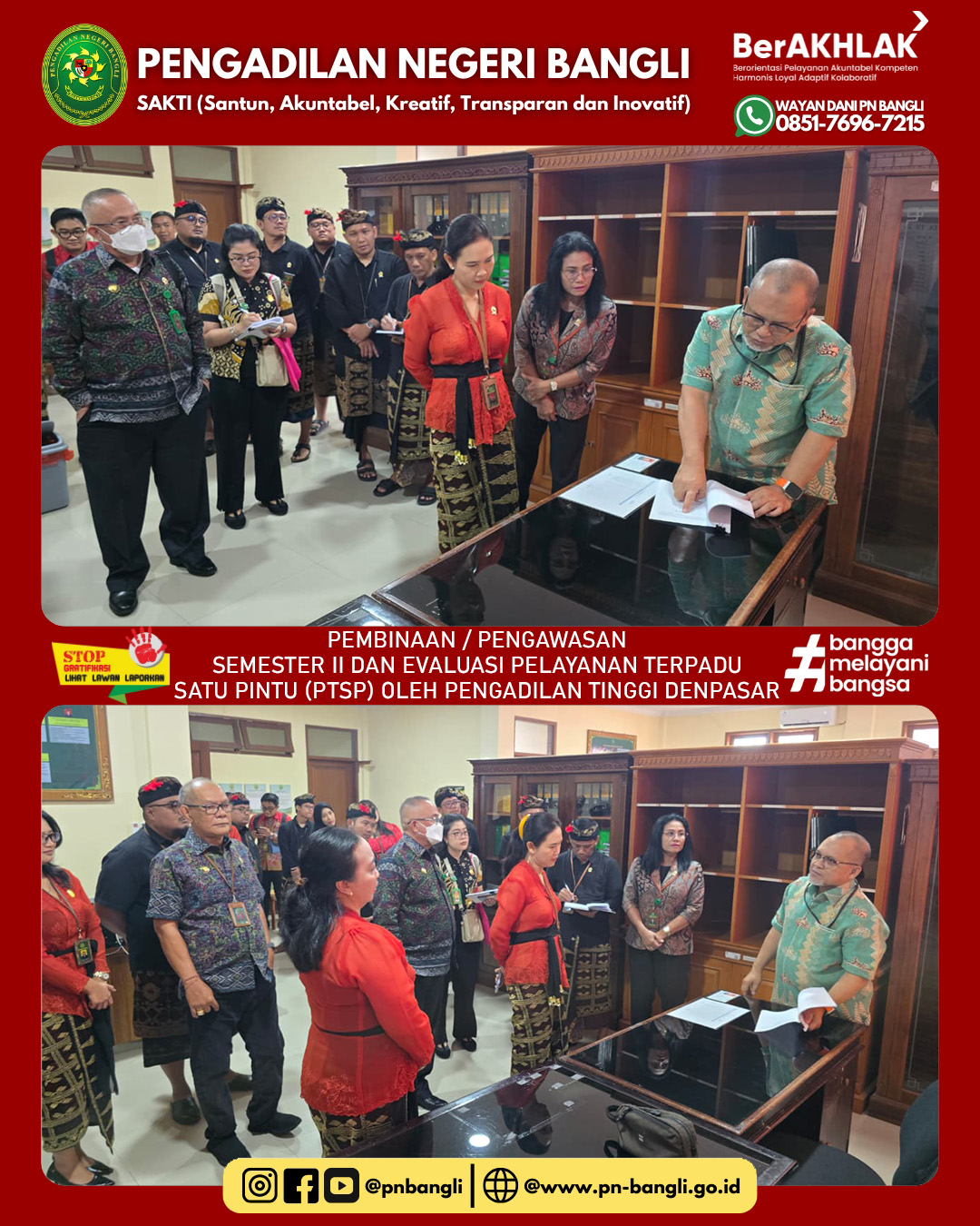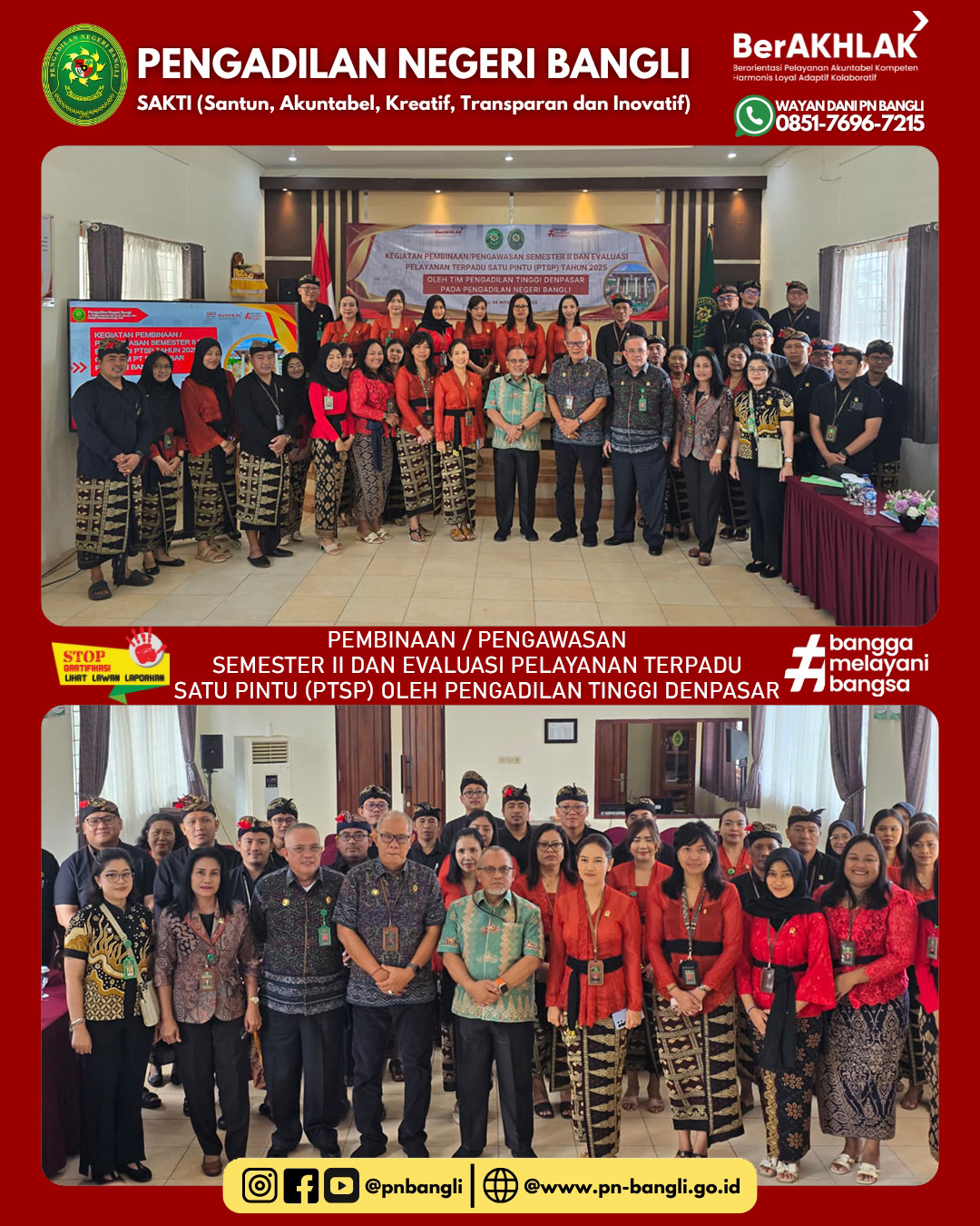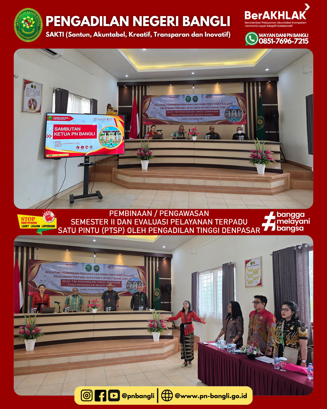 BANGLI - Jumat, 06 November 2025, telah dilaksanakan Kegiatan Pembinaan / Pengawasan Semester II dan Evaluasi Pelayanan Terpadu Satu Pintu (PTSP) Tahun 2025 Oleh Pengadilan Tinggi Denpasar Pada Pengadilan Negeri Bangli.