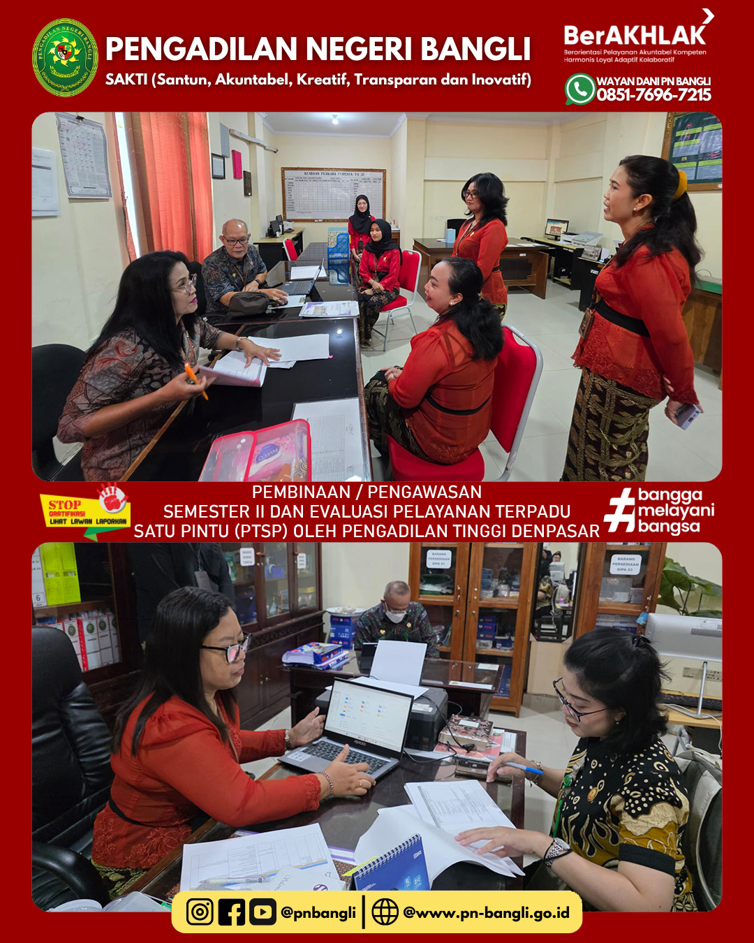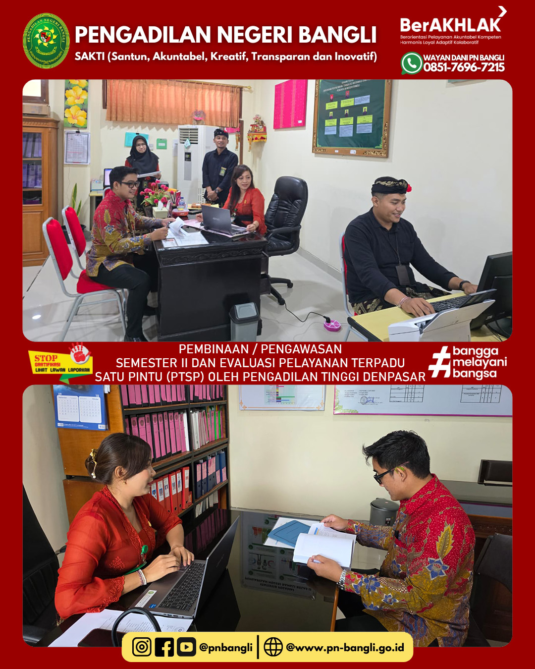 Kegiatan diawali dengan Pembinaan / Pengawasan Semester II Tahun 2025 oleh tim Pengawas Daerah Pengadilan Tinggi Denpasar dan terahkir dilakukannya Monitoring dan Evaluasi terhadap PTSP Pengadilan Negeri Bangli.
