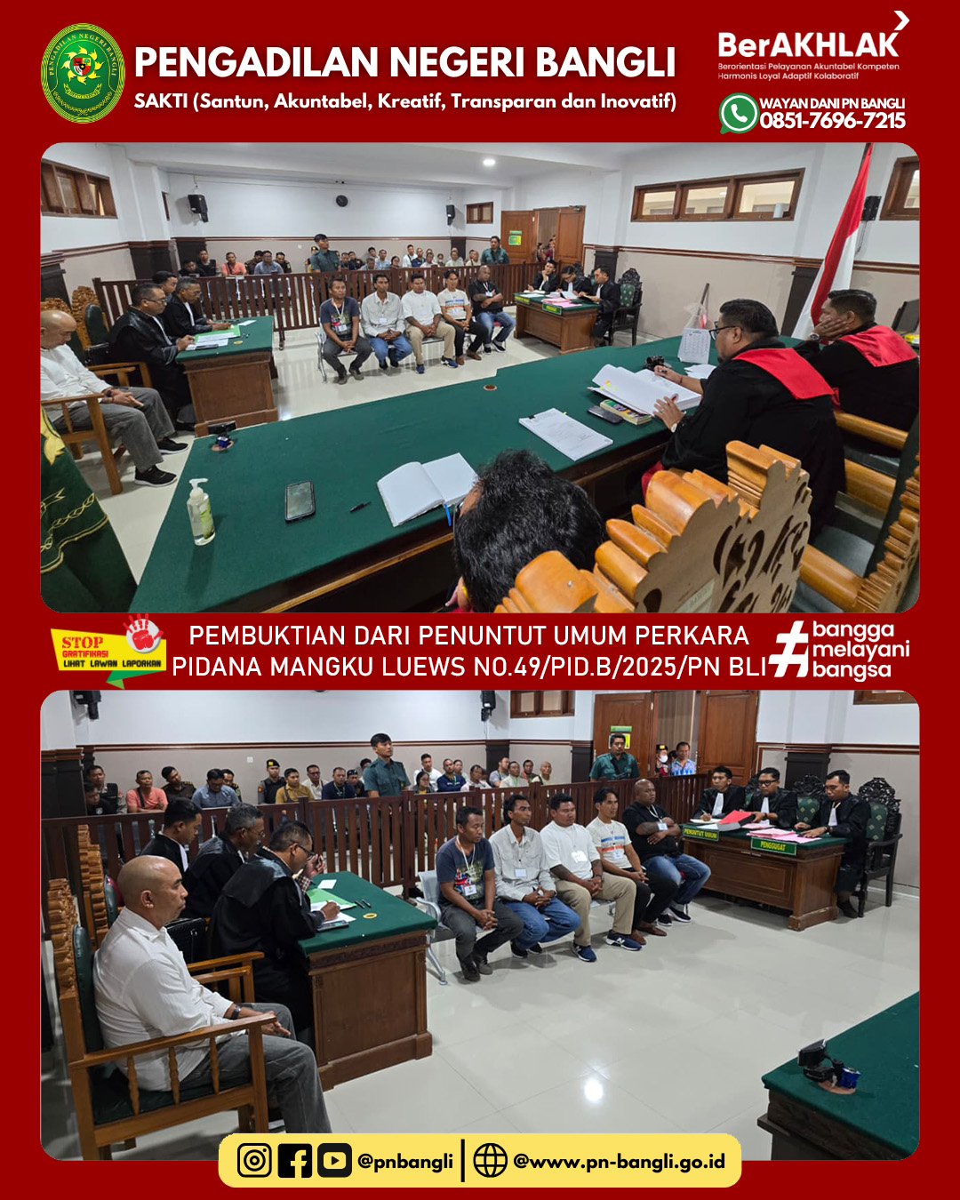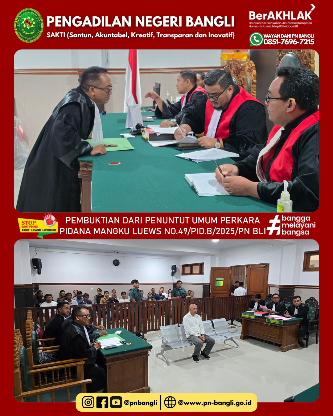 BANGLI - Selasa, 07 Oktober 2025, telah berlangsung sidang perkara No 49/Pid.B/2025/PN Bli dengan agenda Pembuktian dari Penuntut Umum, sidang berlangsung di ruang sidang cakra berlangsung tertib dan aman.