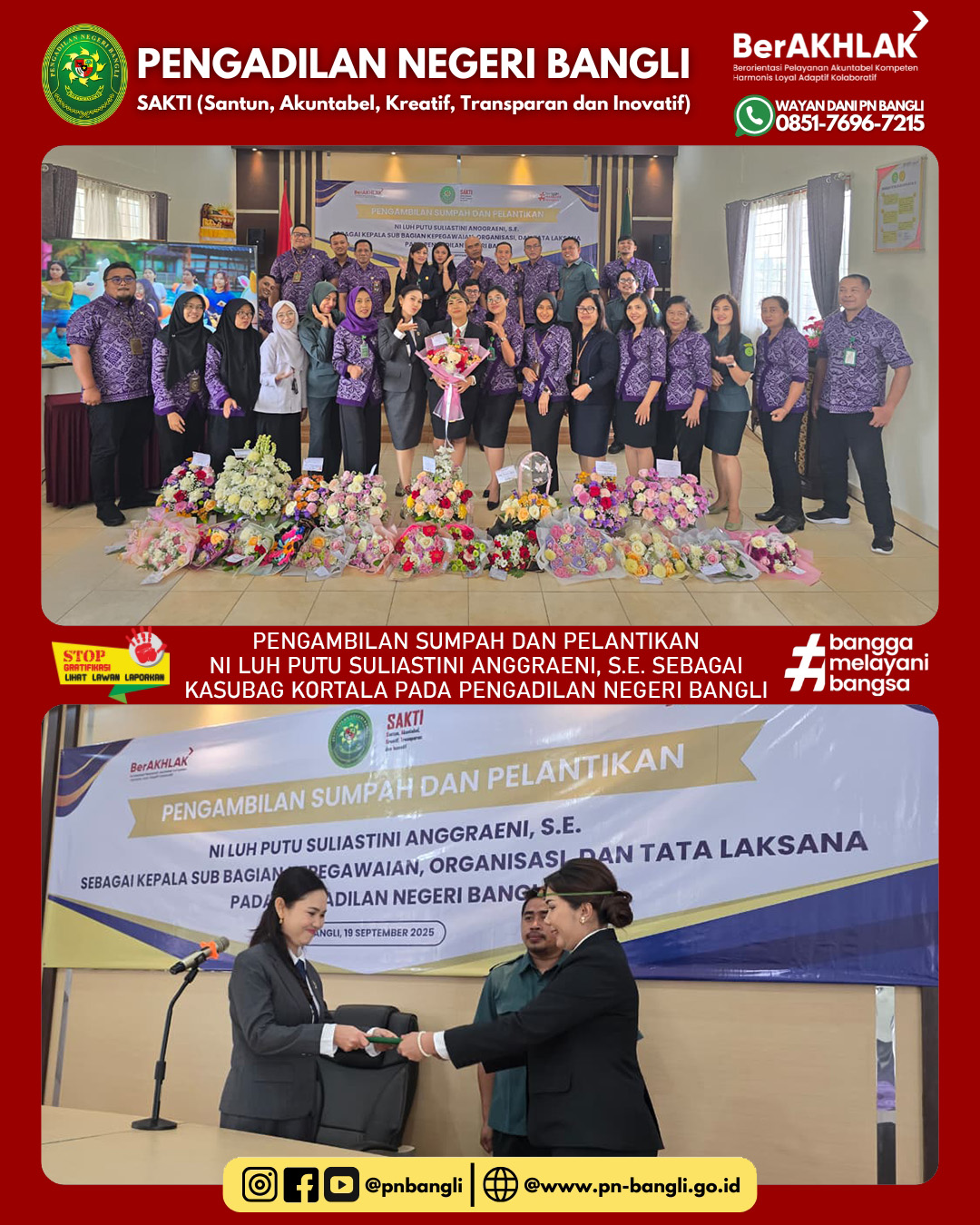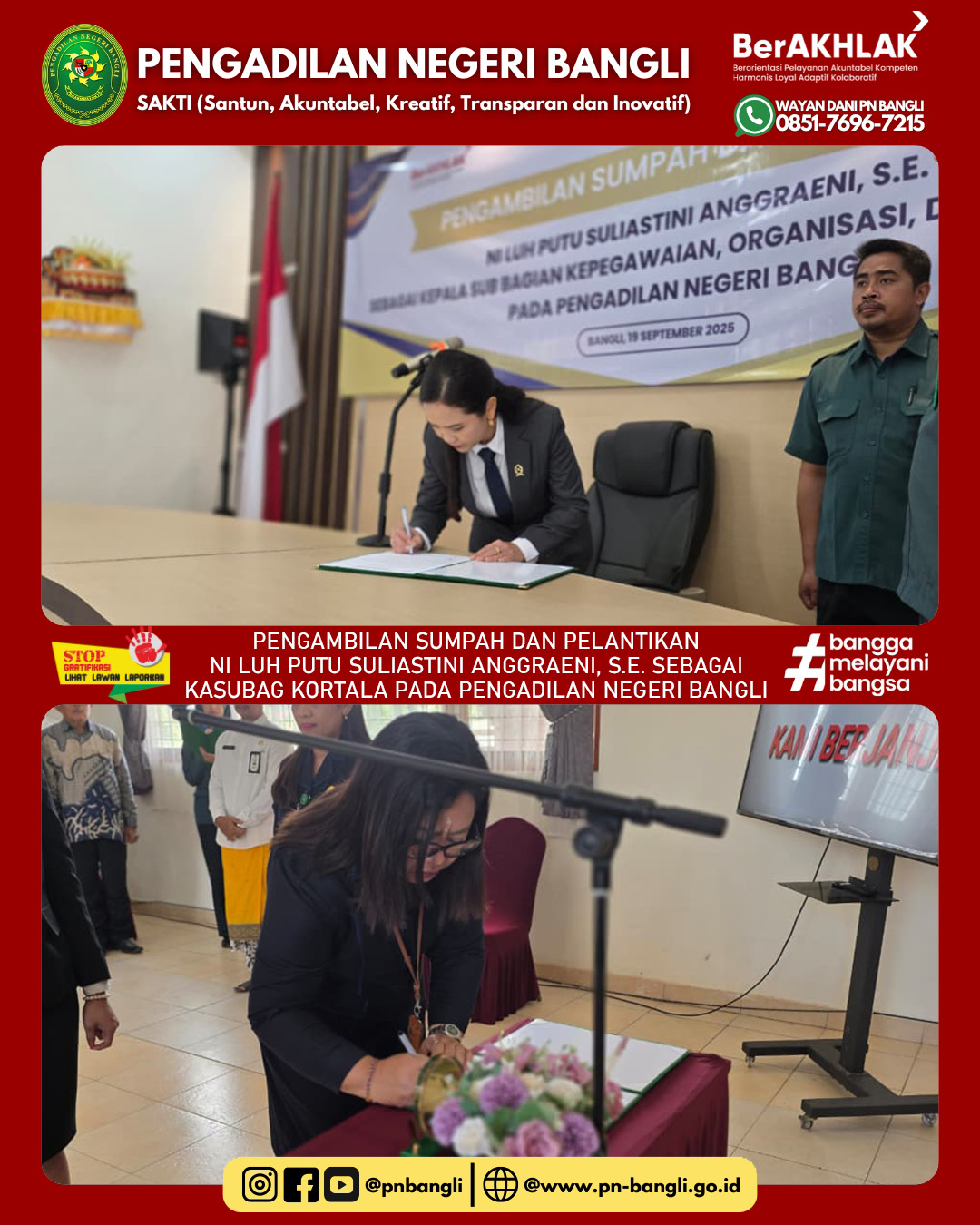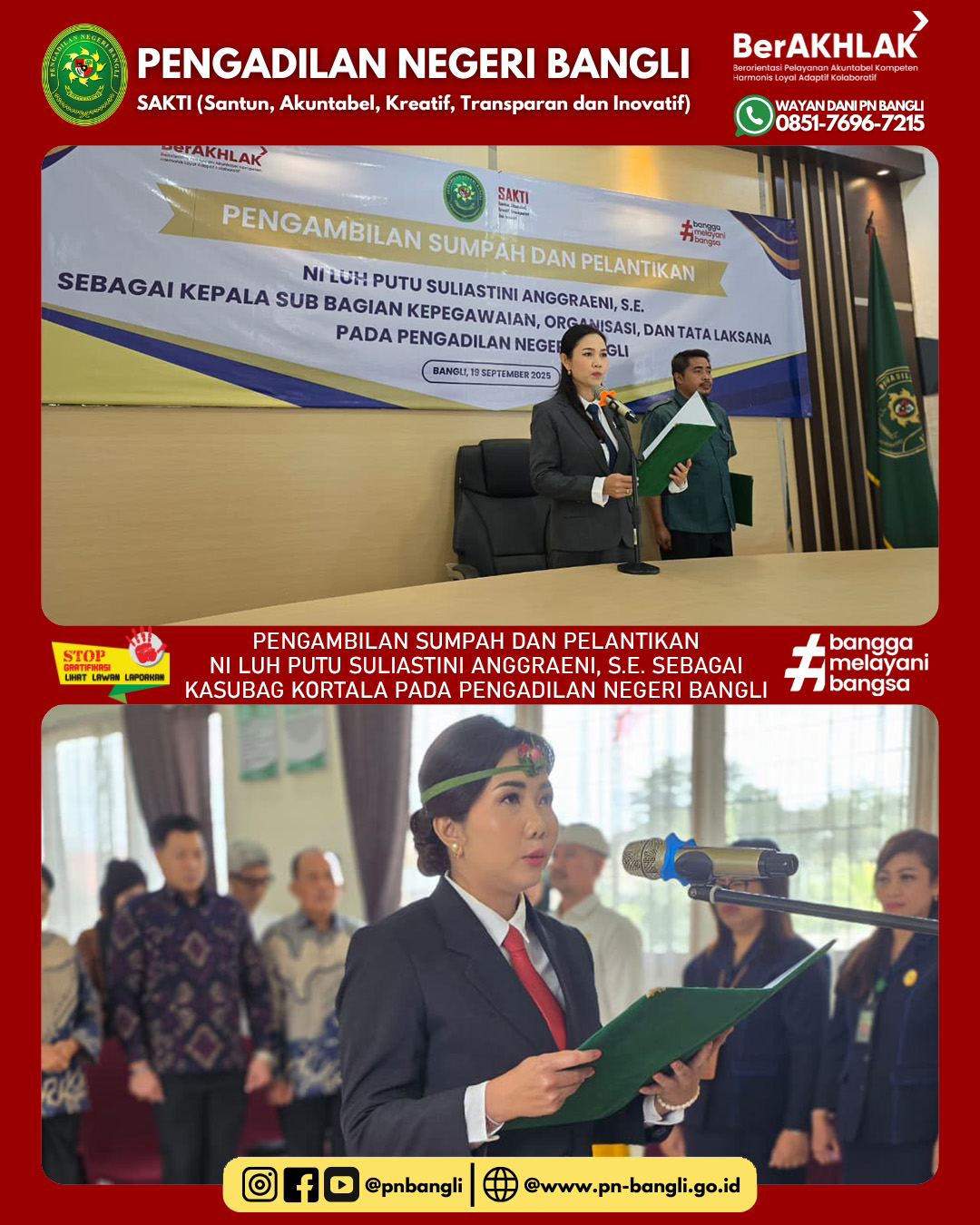 BANGLI - Jumat, 19 September 2025 pukul 09.00 wita s.d. Selesai. Ketua Pengadilan Negeri Bangli Ibu Anak Agung Ayu Diah Indrawati, S.H., M.H. mengambil sumpah dan melantik Ibu Ni Luh Putu Suliastini Anggraeni, S.E. Sebagai Kepala Sub Bagian Kepegawaian Organisasi dan tatalaksana pada Pengadilan Negeri Bangli. Acara berlangsung lancar dan khidmat diikuti oleh seluruh jajaran Pengadilan Negeri Bangli dan juga tamu undangan.
