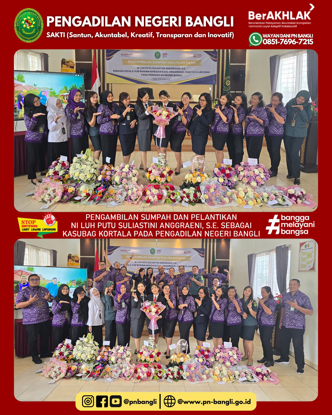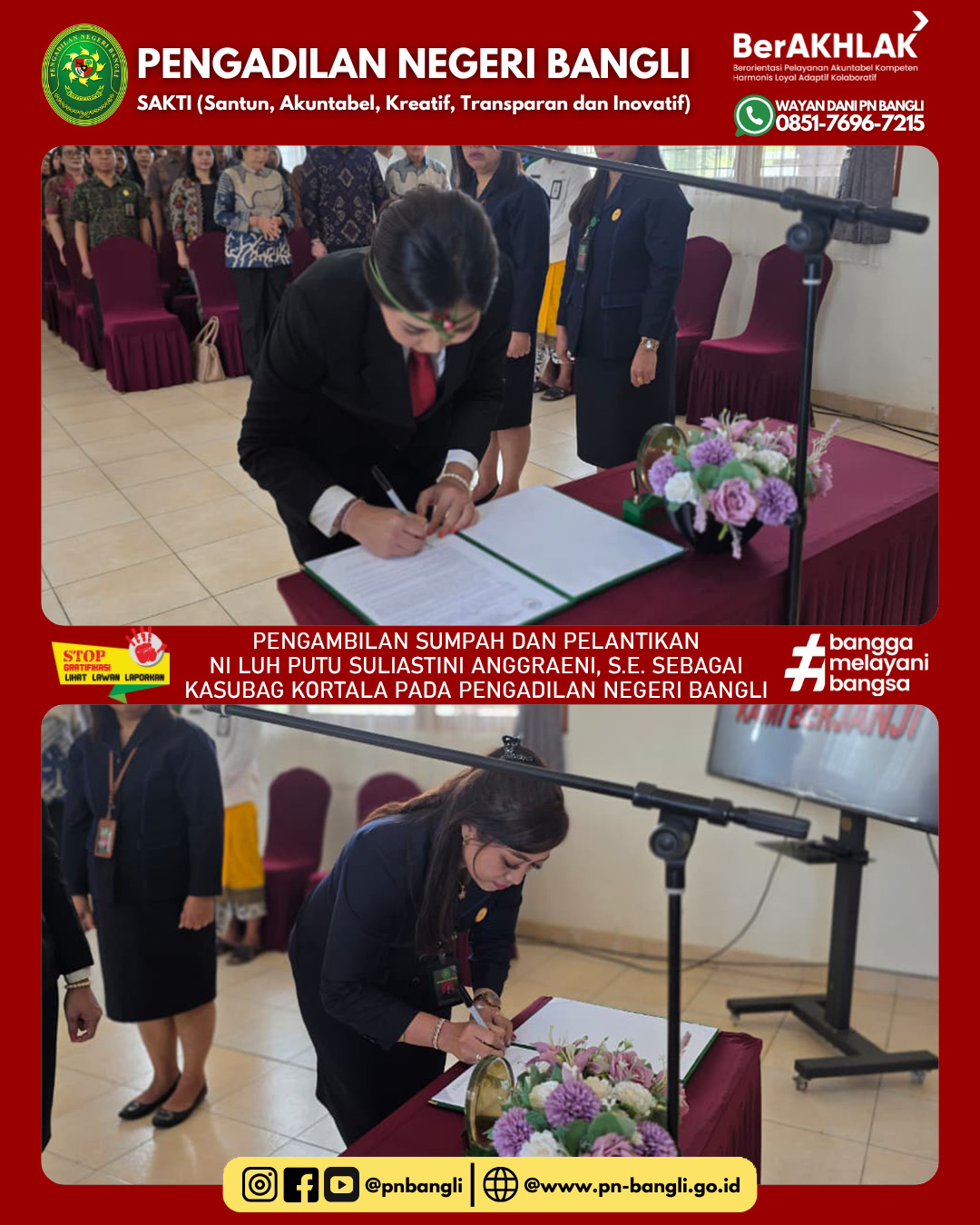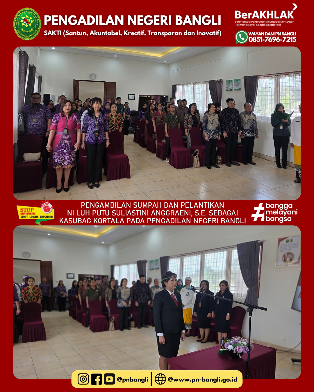 BANGLI - Jumat, 19 September 2025 pukul 09.00 wita s.d. Selesai. Ketua Pengadilan Negeri Bangli Ibu Anak Agung Ayu Diah Indrawati, S.H., M.H. mengambil sumpah dan melantik Ibu Ni Luh Putu Suliastini Anggraeni, S.E. Sebagai Kepala Sub Bagian Kepegawaian Organisasi dan tatalaksana pada Pengadilan Negeri Bangli. Acara berlangsung lancar dan khidmat diikuti oleh seluruh jajaran Pengadilan Negeri Bangli dan juga tamu undangan.