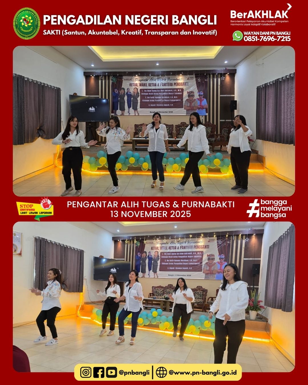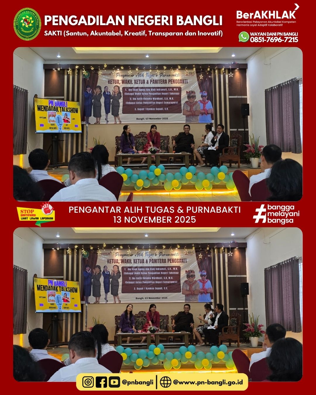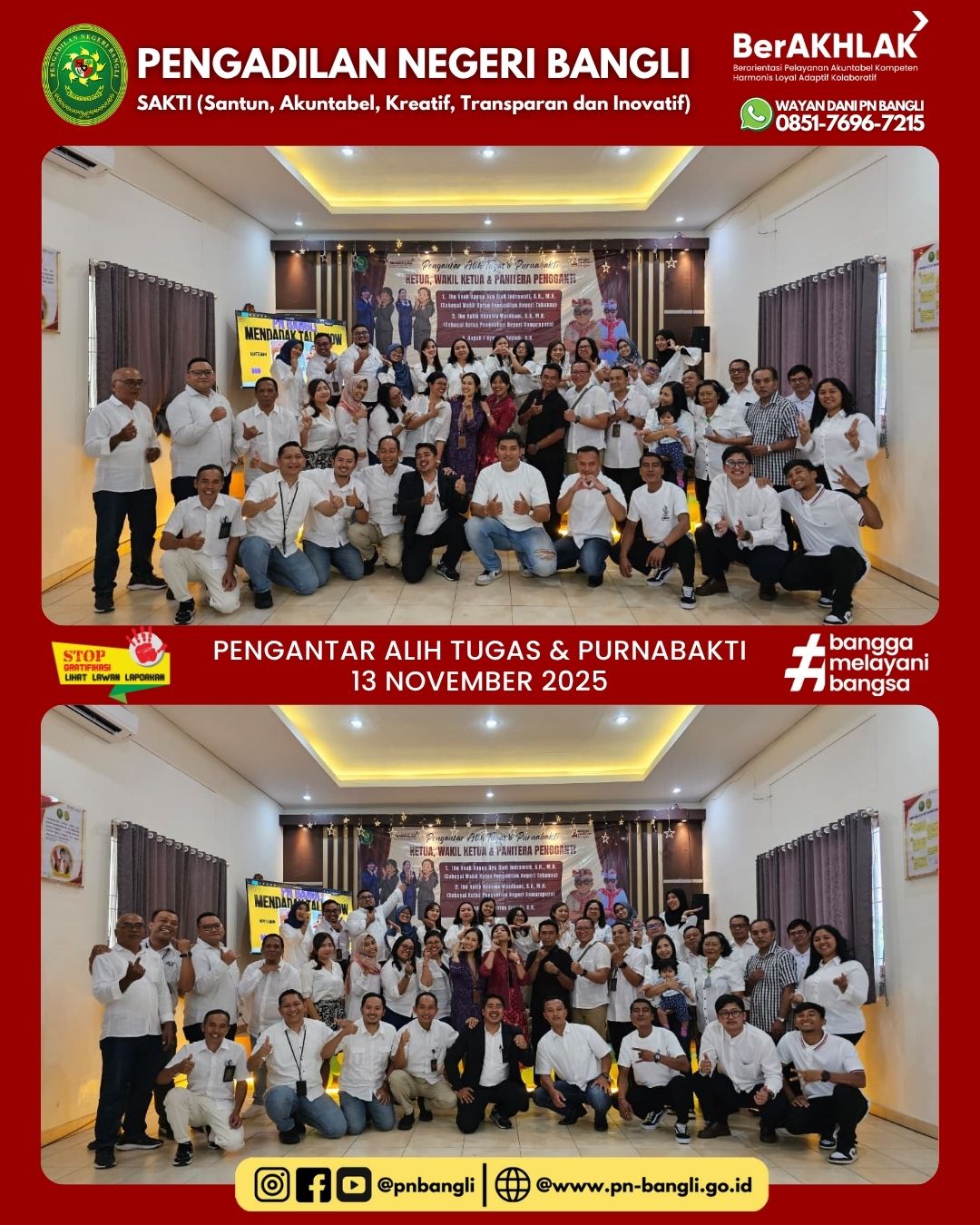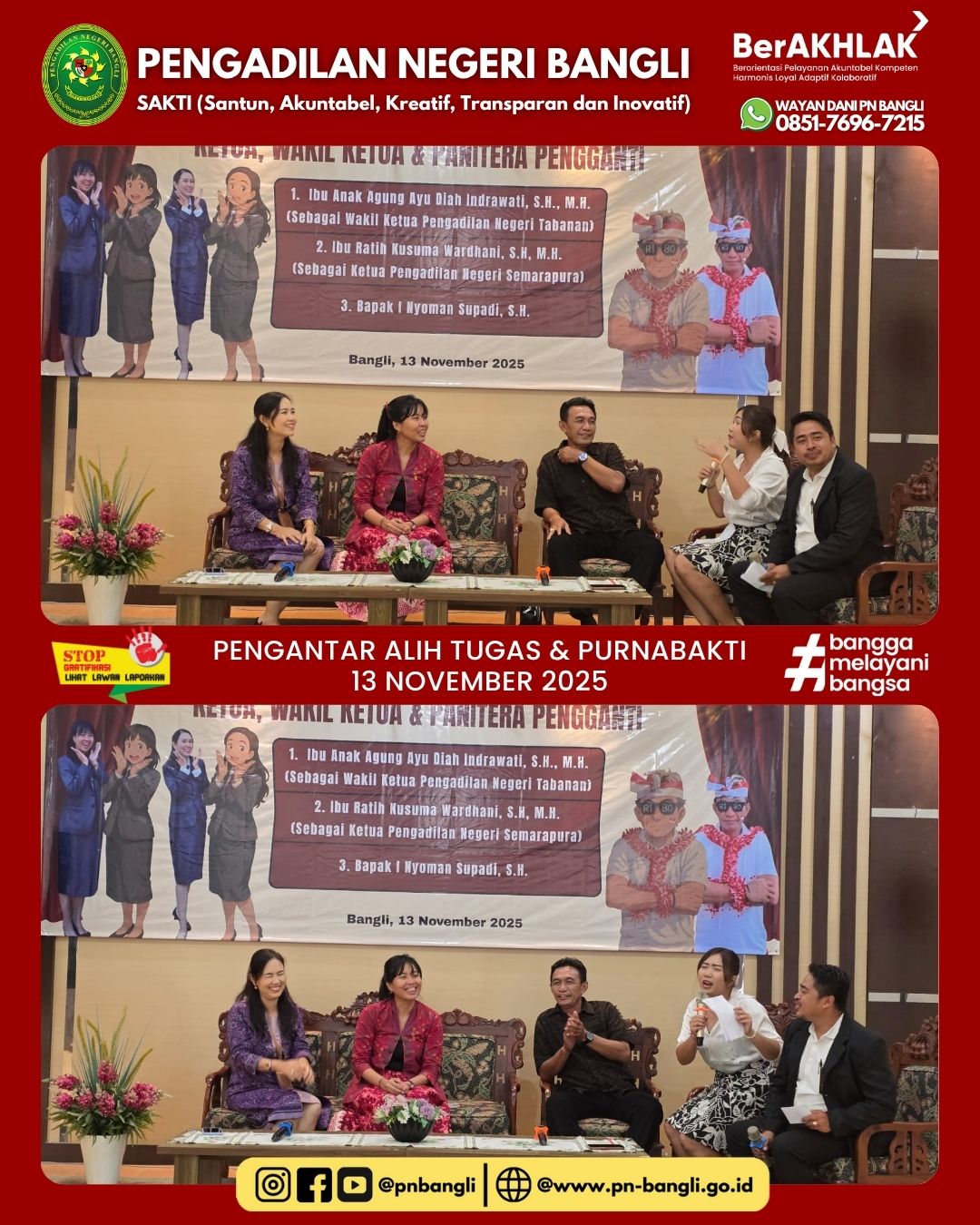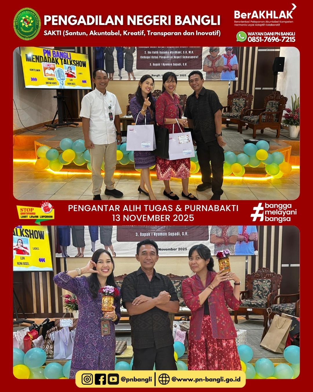 BANGLI - Kamis, 13 November 2025, Pukul 15.00 Wita bertempat di Ruang Aula Pengadilan Negeri Bangli, diselenggarakan acara Pengantar Pengantar Alih Tugas dan Purnabakti, yaitu :