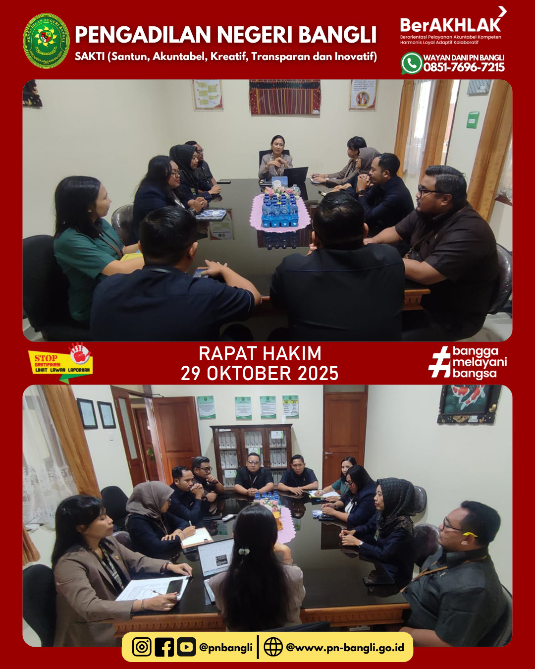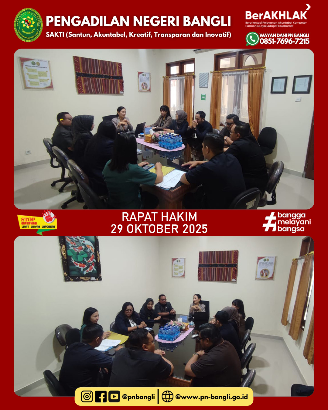 BANGLI - Rabu, 29 Oktober 2025 pukul 09.00 WITA, bertempat di ruang rapat pimpinan diselenggarakan Rapat Hakim yang dipimpin langsung oleh Ketua Pengadilan Negeri Bangli dan diikuti oleh Wakil Ketua serta Hakim-hakim Pengadilan Negeri Bangli.