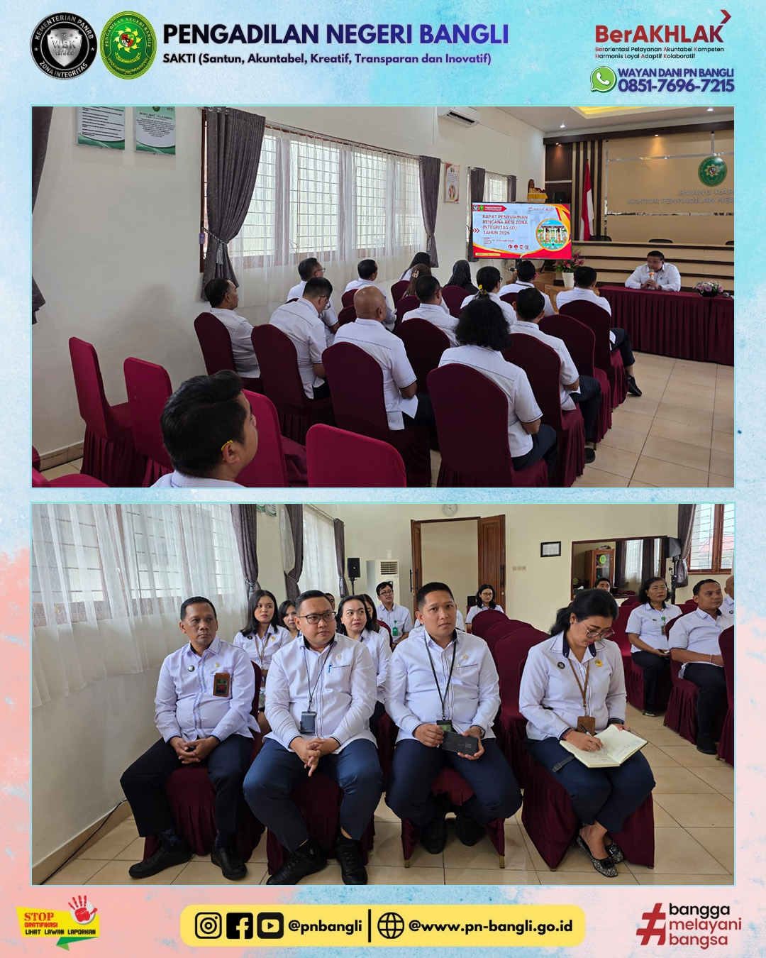 BANGLI - Senin, 12 Januari 2026, telah dilaksanakan Rapat Penyusunan Rencana Aksi Zona Integritas Tahun 2026 dimana Ketua Pengadilan Negeri Bangli selaku Pembina Zona Integritas menyampaikan Rencana Strategis Langkah Konkret, Target Waktu dan Penanggung Jawab untuk menciptakan unit kerja Pembangunan Zona Integritas Wilayah Bebas Korupsi (WBK) dan Menuju Wilayah Bebas Birokrasi Melayani (WBBM) pada Pengadilan Negeri Bangli yang diikuti oleh Ketua Tim Pembangunan Zona Integritas, seluruh Koordinator Area ZI serta Anggota Tim Area Pembangunan Zona Integritas.