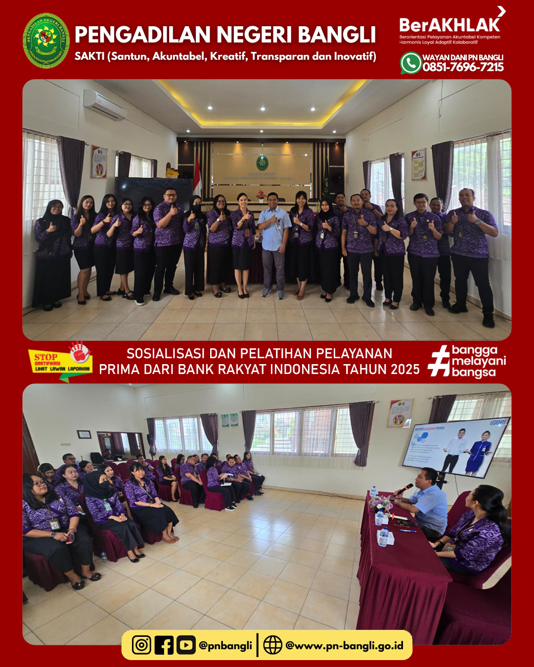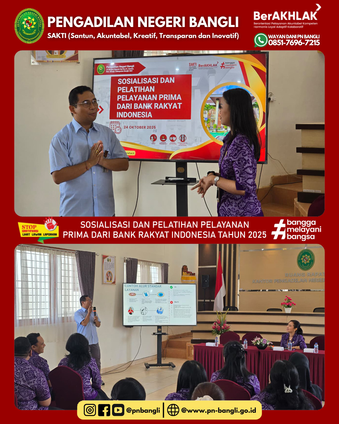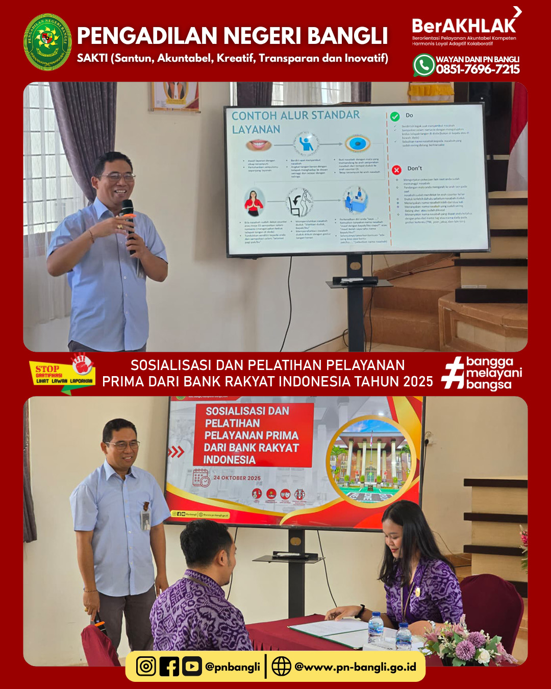 BANGLI - Jumat, 24 Oktober 2025, sebagai upaya peningkatan kompetensi Sumber Daya Manusia (SDM) sekaligus peningkatan kualitas pelayanan publik, Pengadilan Negeri Bangli menyelenggarakan Sosialisasi Dan Pelatihan Pelayanan Prima Dari Bank Rakyat Indonesia Tahun 2025, sebagai narasumber yaitu Bapak Putu Mahendra Jaya yang menjabat Asisten Manajer Operasional.