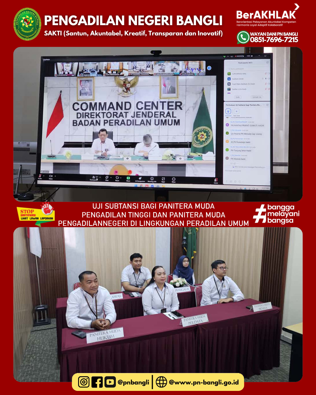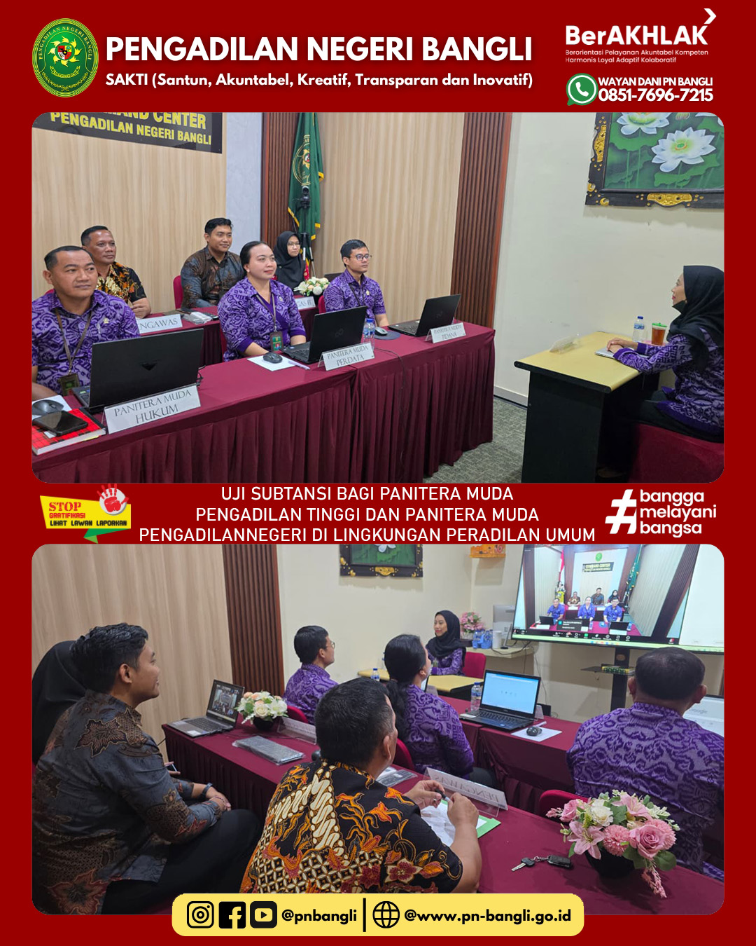 BANGLI - Kamis, 23 Oktober 2025 pukul 10.32 Wita s.d. 12.32, Panitera Muda Perdata, Panitera Muda Pidana dan Panitera Muda Hukum Pengadilan Negeri Bangli mengikuti Uji Subtansi bagi Panitera Muda Pengadilan Tinggi dan Panitera Muda Pengadilan Negeri di Lingkungan Peradilan Umum. Ujian ini di awasi langsung oleh Hakim Ibu Risky Edy Nawawi, S.H., L.L.M. dan Panitera Bapak Sugeng Irfandi, S.H. yang dilaksanakan secara virtual melalui Zoom Meeting.