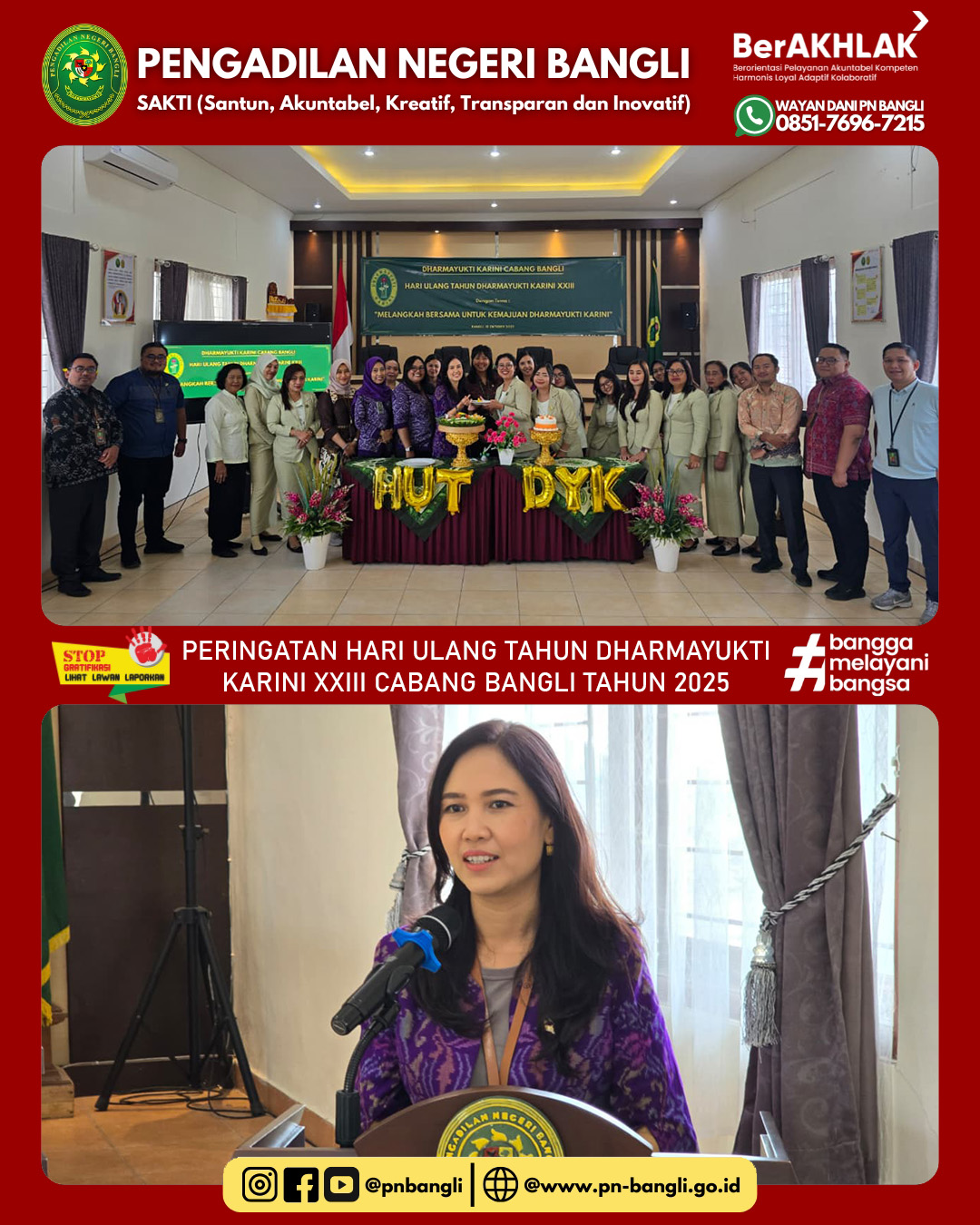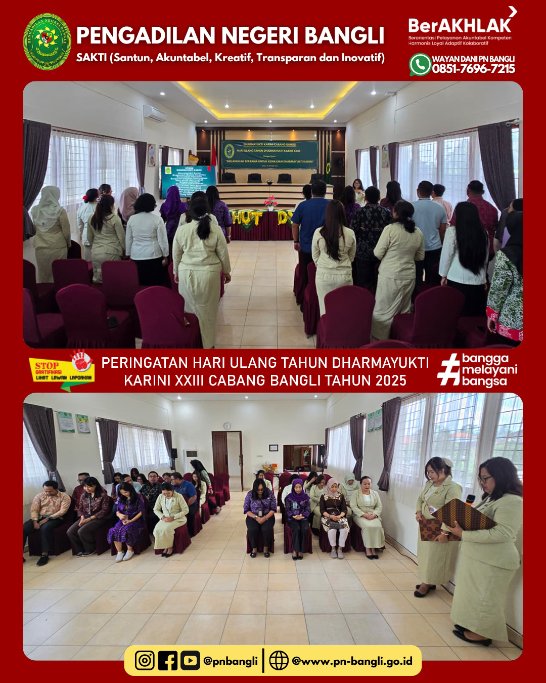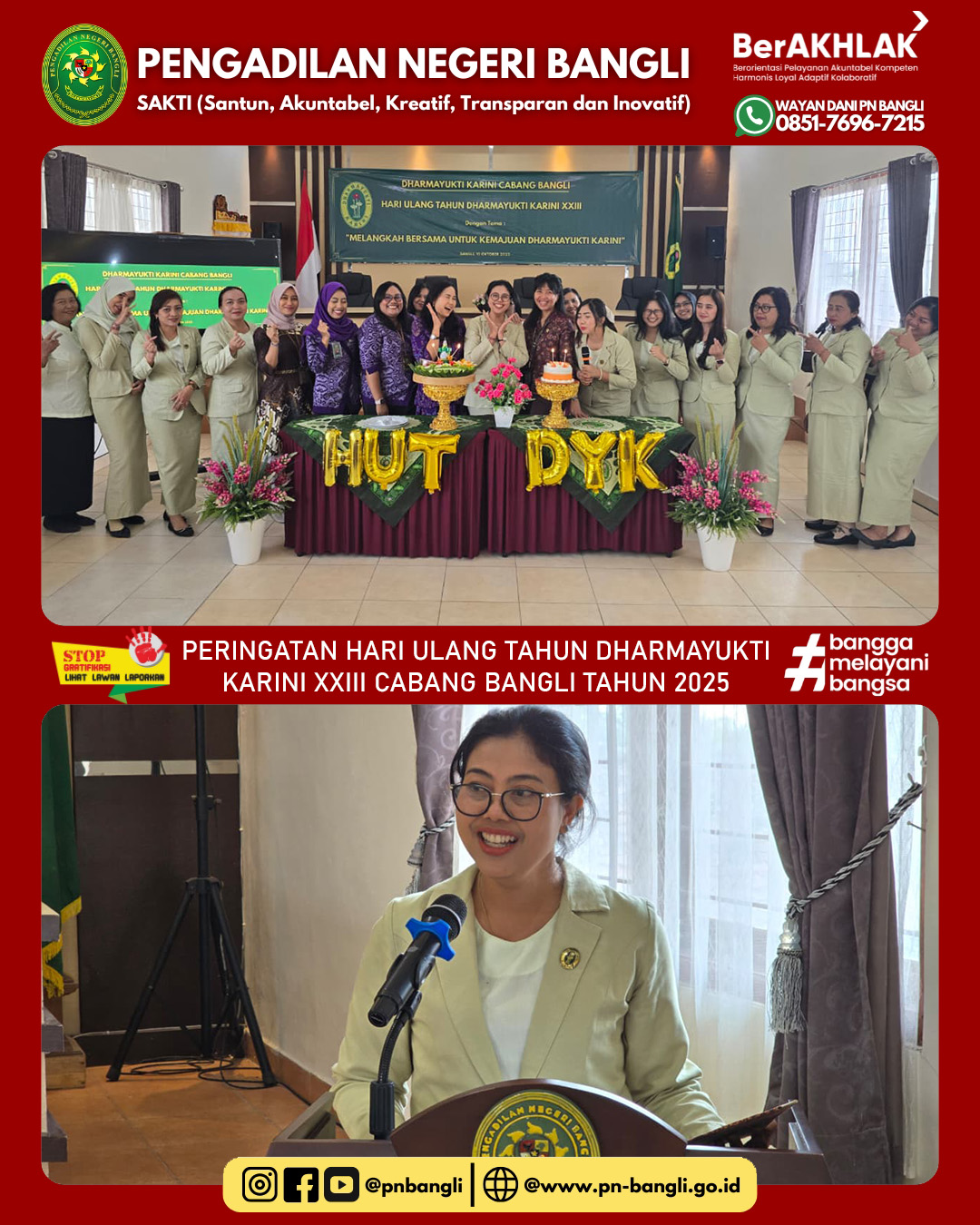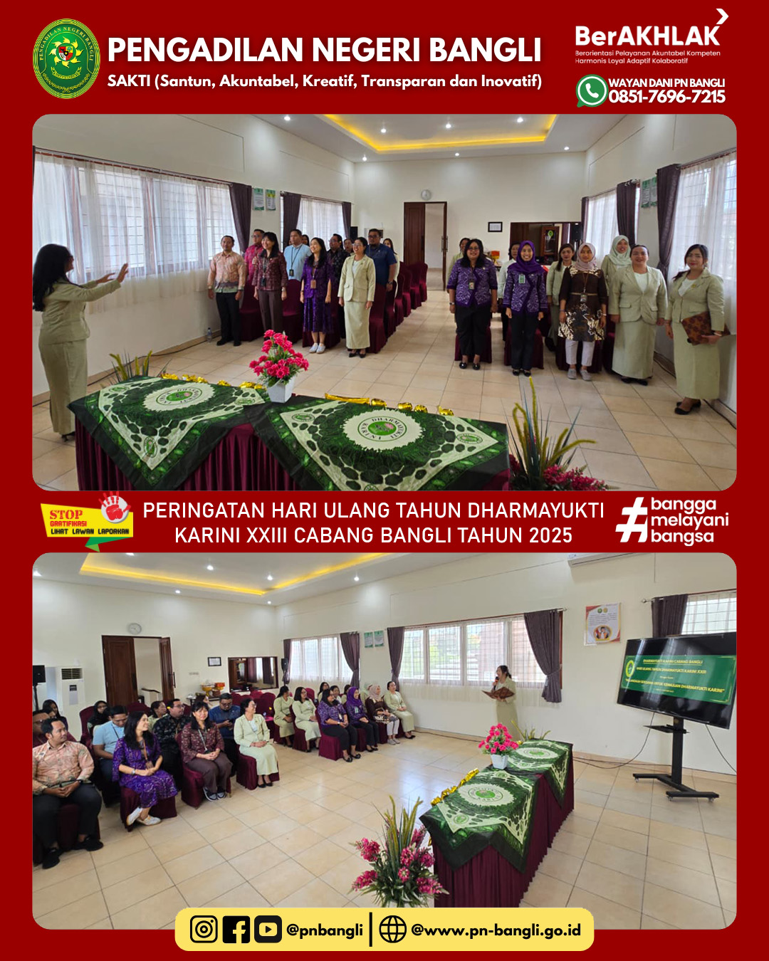 BANGLI - Jumat, 10 Oktober 2025 pukul 09.00 Wita s/d Selesai. Dharmayukti Karini Cabang Bangli melaksanakan kegiatan Peringatan Hari Ulang Tahun Dharmayukti Karini XXIII Tahun 2025  dengan tema "MELANGKAH BERSAMA UNTUK KEMAJUAN DHARMAYUKTI KARINI". Kegiatan ini dilaksanakan di gedung Aula Pengadilan Negeri Bangli.