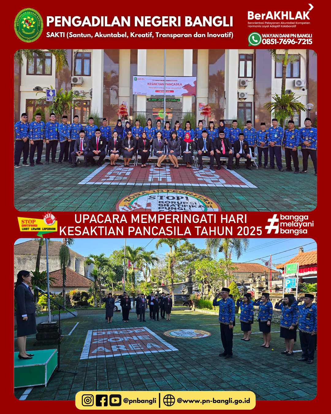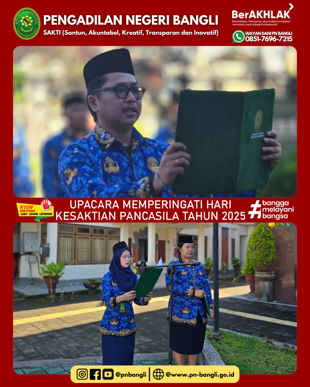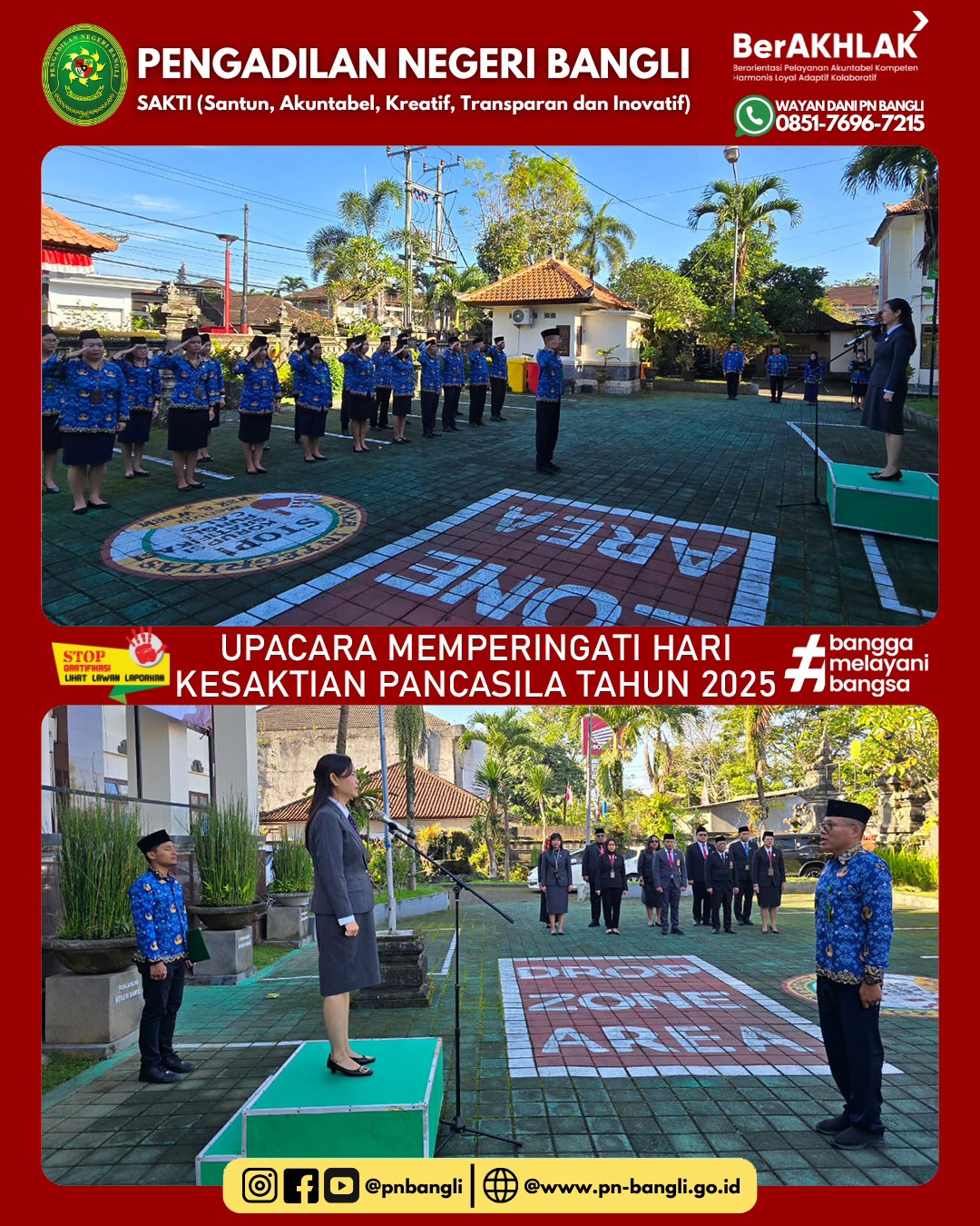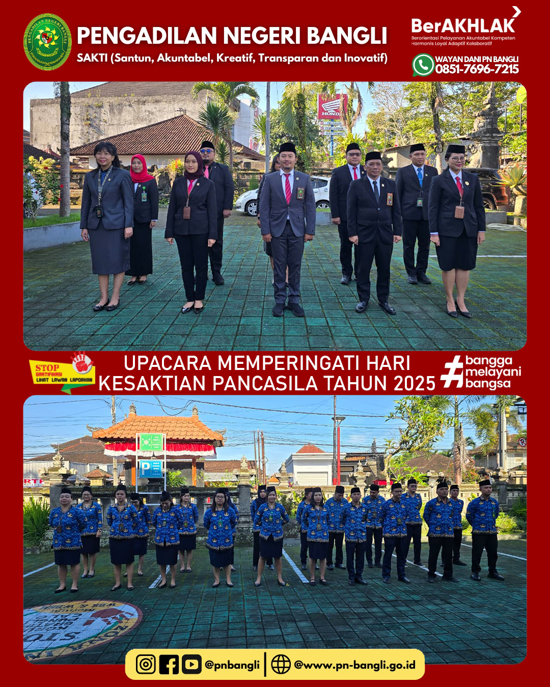 BANGLI - Rabu, 1 Oktober 2025 pukul 08.00 wita, telah dilaksanakan upacara memperingati hari Kesaktian Pancasila di halaman depan kantor Pengadilan Negeri Bangli.
